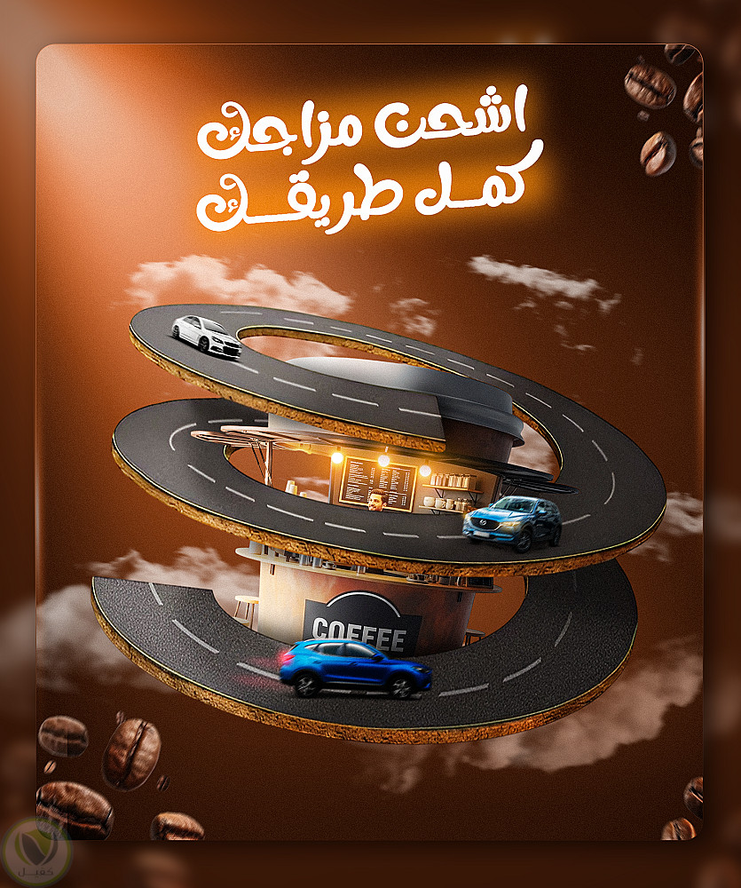 تصميم سوشيال ميديا انيق وبسيط عن القهوة وبفكره بسيط تبرز حب شرب القهوة علي الطريق وانها تجعلك نشيط طول الطريق