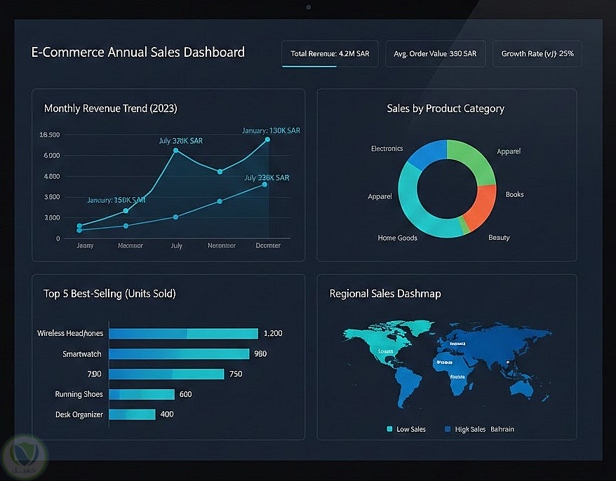 لوحة معلومات تفاعلية (Dashboard) لتحليل أداء المبيعات السنوي لشركة تجارة إلكترونية.
