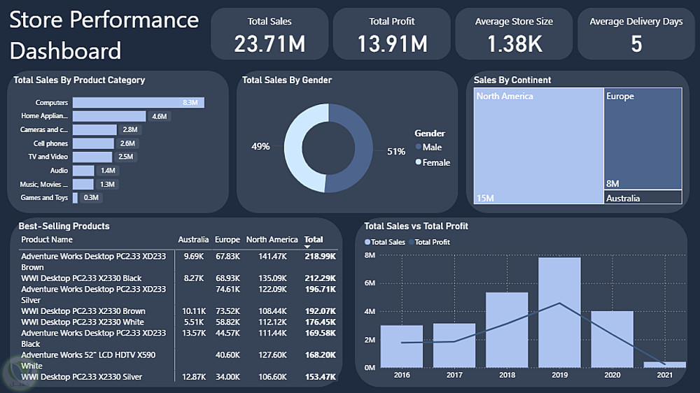 تقدم لوحة معلومات أداء المتجر هذه نظرة عامة واضحة وشاملة لمقاييس الأعمال الرئيسية، حيث تسلط الضوء على إجمالي مبيعات بقيمة 23.71 مليون دولار وإجمالي أرباح بقيمة 13.91 مليون دولار. تقوم اللوحة بتقسيم أداء المبيعات بفعالية حسب فئة المنتج، والجنس، والقارة، وتحدد أجهزة الكمبيوتر وأمريكا الشمالية كأفضل الفئات أداءً في مجالات كل منهما. كما تعرض اللوحة اتجاهات المبيعات والأرباح على مدار ست سنوات، مع جدول مفصل يعرض المنتجات الفردية الأكثر مبيعًا. تتيح هذه النظرة الشاملة تحليلًا سريعًا للأداء العام ومحركات النجاح الرئيسية.