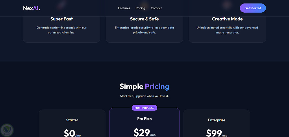 - أقسام متكاملة: Hero – Features – Pricing – Footer.