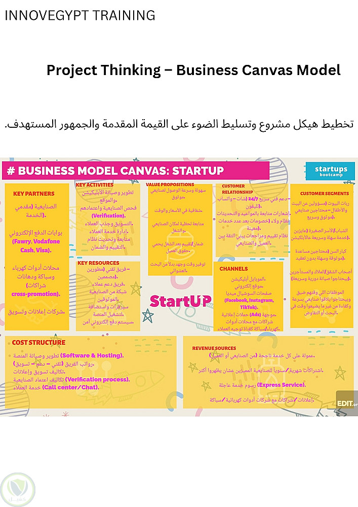 Business Model Canvas متكامل بكل عناصره (القيمة، الشرائح، القنوات، الإيرادات… إلخ).