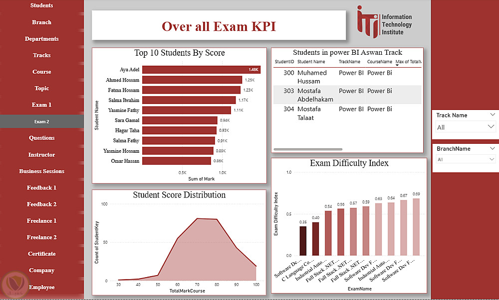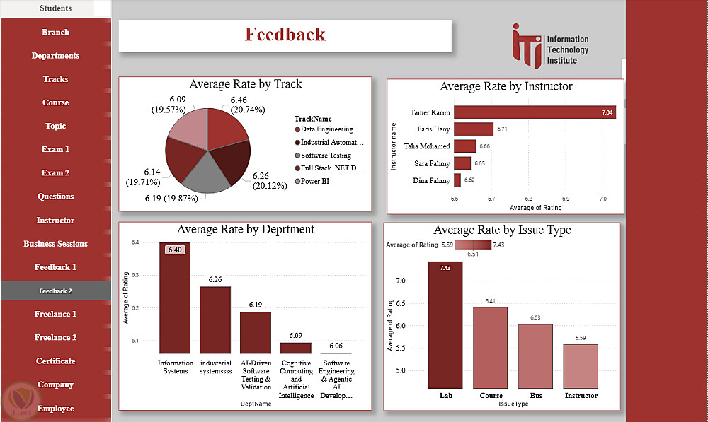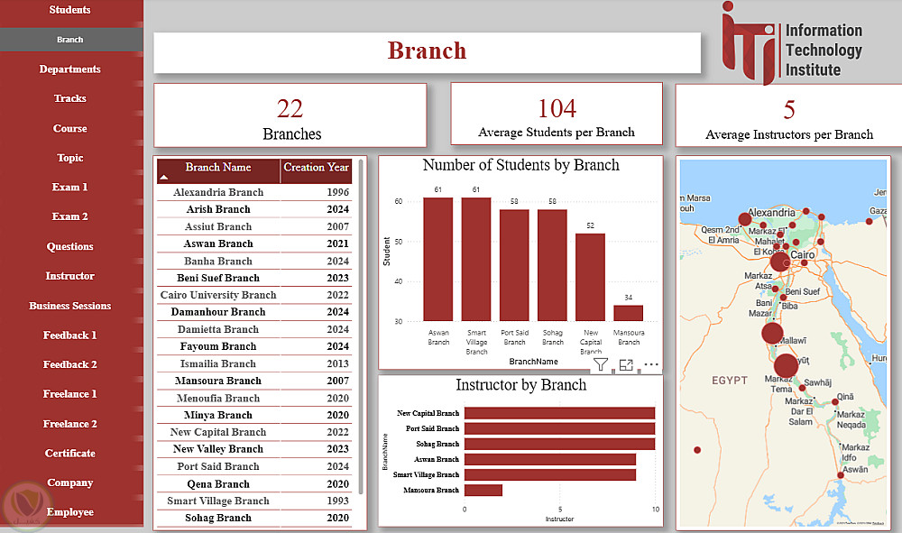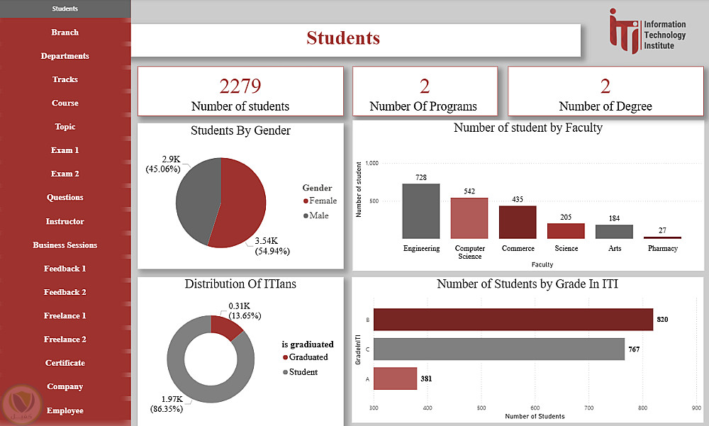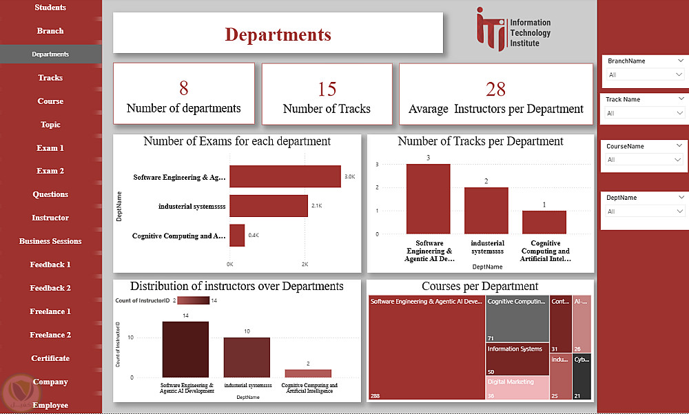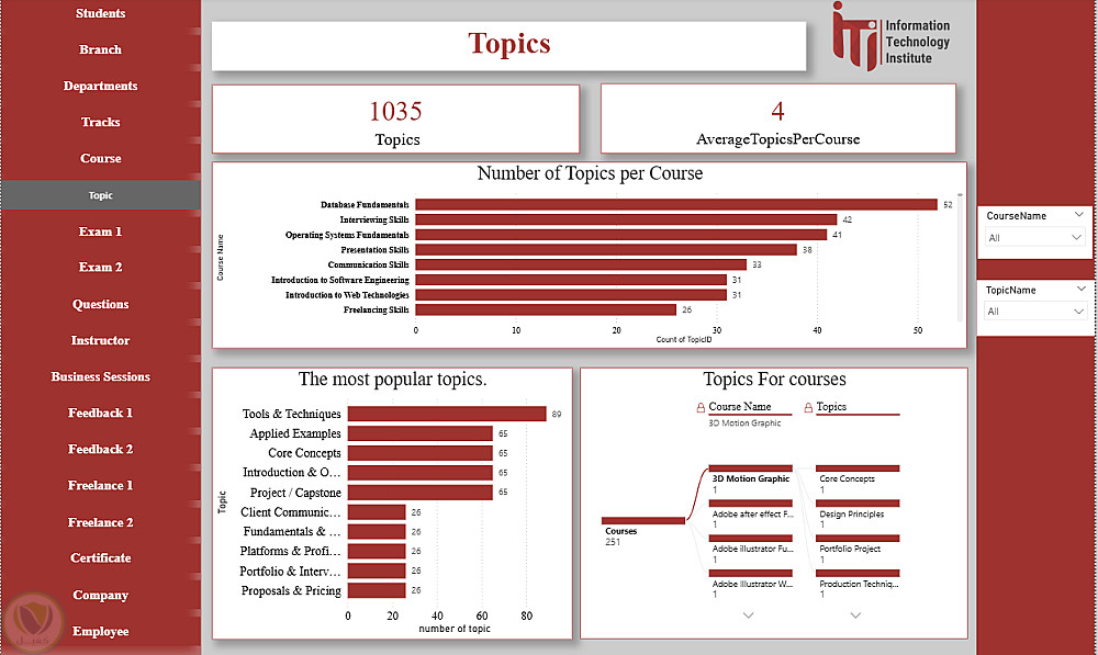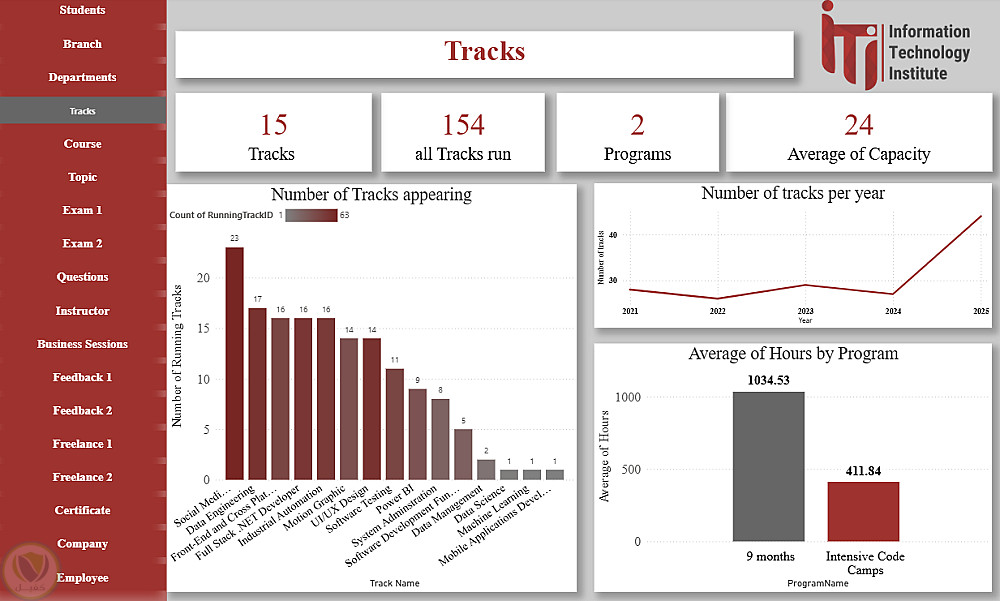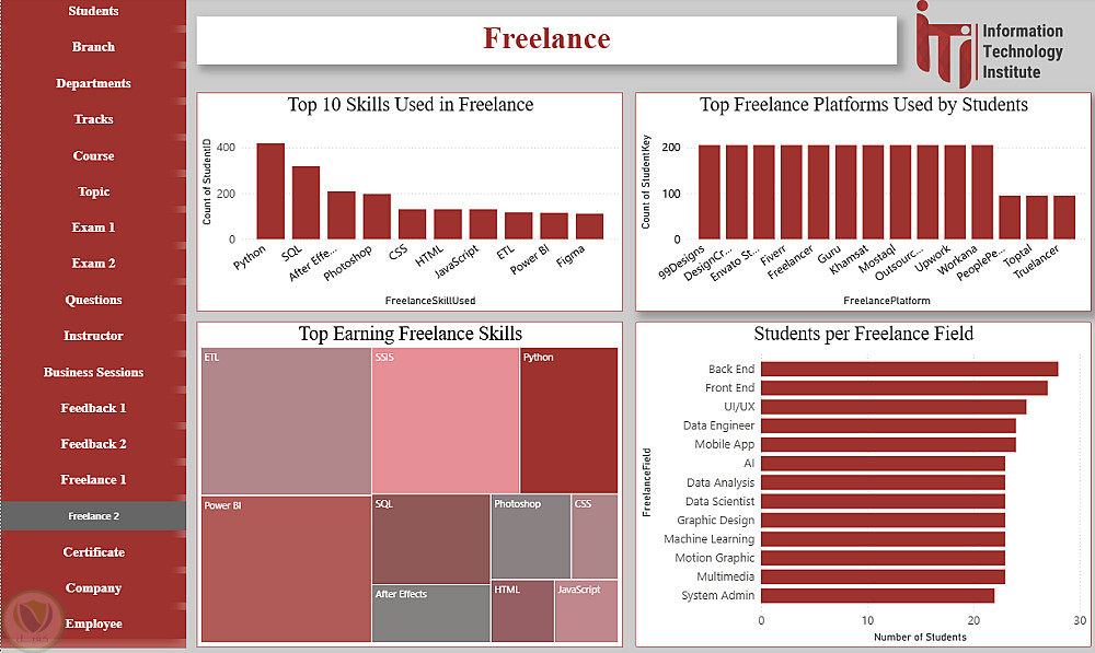 هذا الداشبورد عبارة عن منصة متكاملة لتحليل ومتابعة كل عناصر منظومة ITI، حيث يغطي بيانات الطلاب، الأقسام، الفروع، التراكات، المدربين، الكورسات والمواضيع، الامتحانات وتصحيحها، تقييمات الطلاب، فرص العمل الحر، الشركات التي يعمل بها الخريجون، شهادات التدريب، وجلسات الأعمال. يوفر الداشبورد رؤى شاملة لاتخاذ القرارات، تحسين الأداء الأكاديمي، متابعة توظيف الخريجين، ودعم الاستراتيجيات التعليمية والتطويرية داخل ITI.