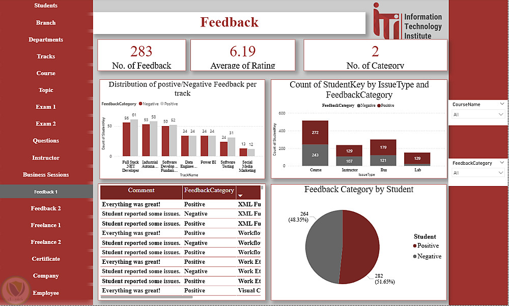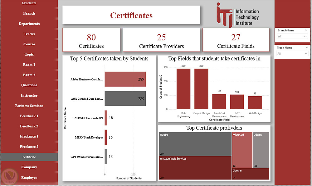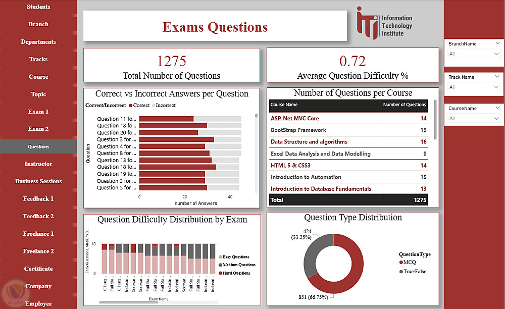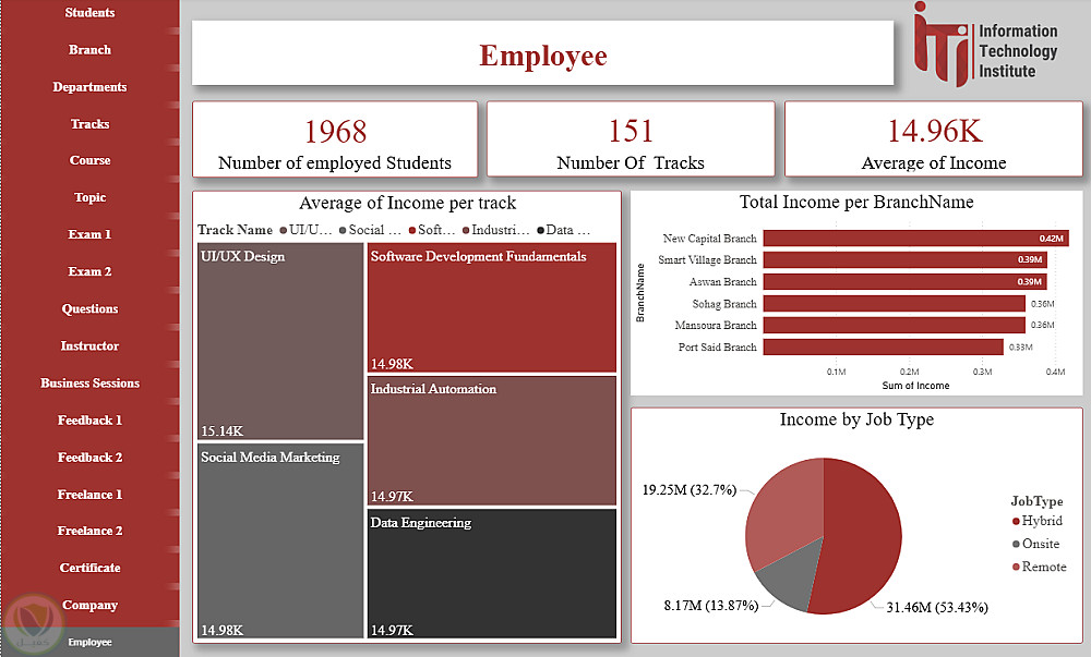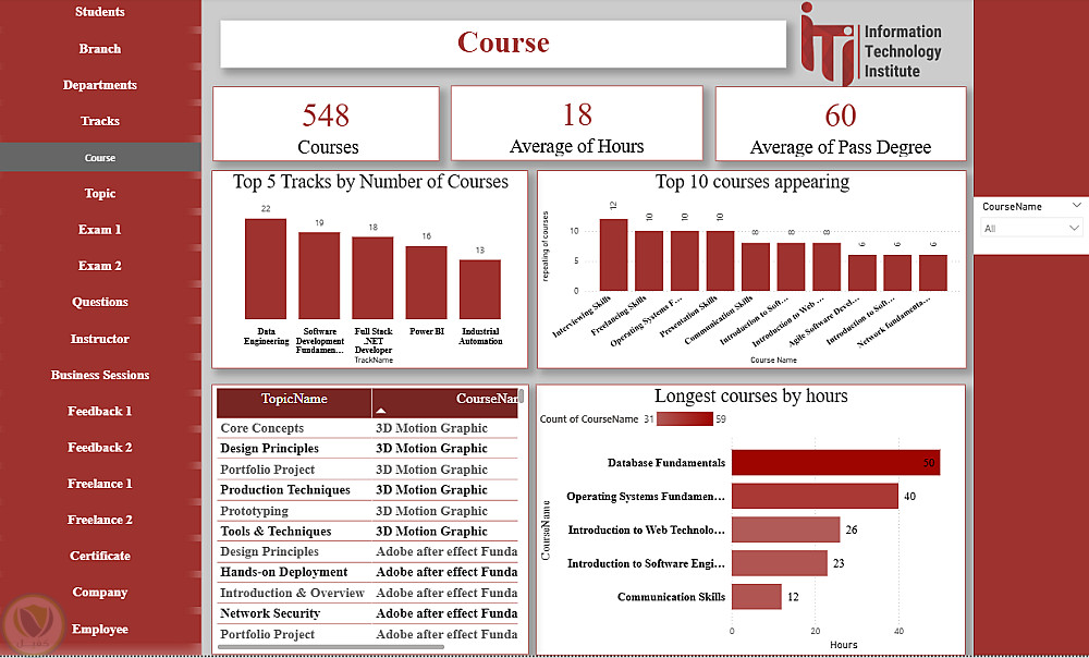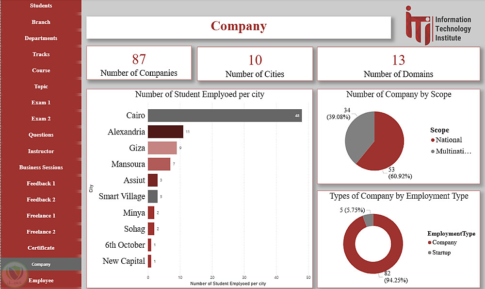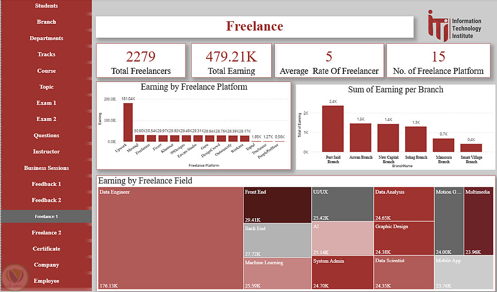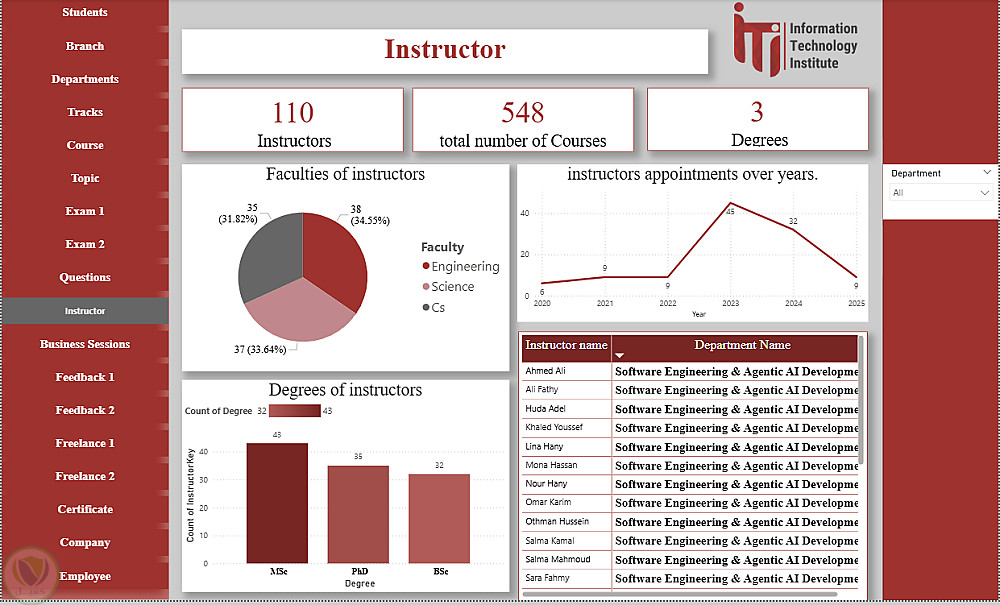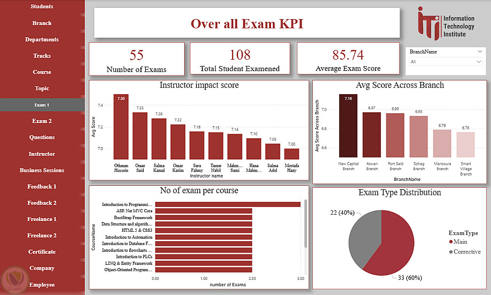 هذا الداشبورد عبارة عن منصة متكاملة لتحليل ومتابعة كل عناصر منظومة ITI، حيث يغطي بيانات الطلاب، الأقسام، الفروع، التراكات، المدربين، الكورسات والمواضيع، الامتحانات وتصحيحها، تقييمات الطلاب، فرص العمل الحر، الشركات التي يعمل بها الخريجون، شهادات التدريب، وجلسات الأعمال. يوفر الداشبورد رؤى شاملة لاتخاذ القرارات، تحسين الأداء الأكاديمي، متابعة توظيف الخريجين، ودعم الاستراتيجيات التعليمية والتطويرية داخل ITI.