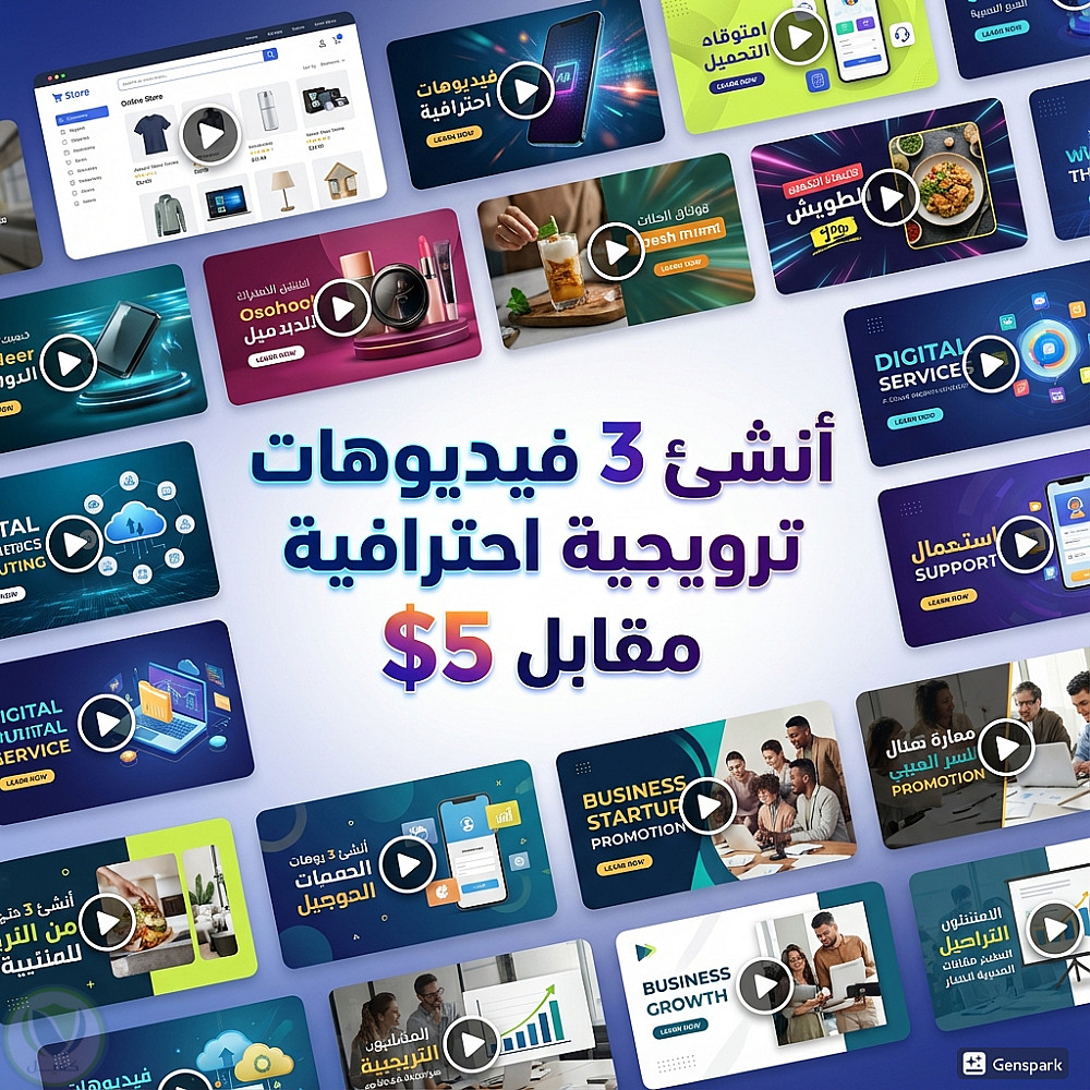 تُظهر الصورة تصميماً إعلانياً جذاباً لخدمة صناعة المحتوى المرئي، حيث يعتمد على عرض شبكي (Grid) لمجموعة متنوعة من النماذج الحية للفيديوهات. تتوسط التصميم عبارة تسويقية قوية باللغة العربية: "أنشئ 3 فيديوهات ترويجية احترافية مقابل 5$"، مع استخدام تدرج لوني عصري يجمع بين البنفسجي والبرتقالي لجذب الانتباه.