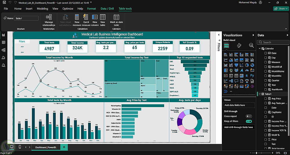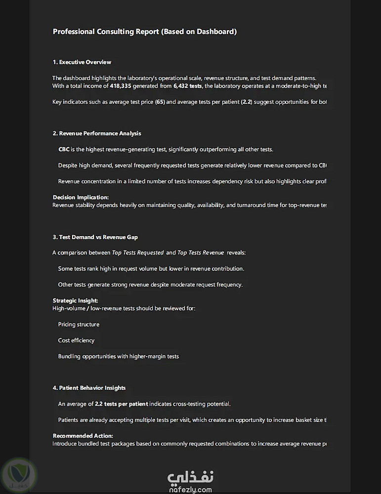 هذا المشروع يعرض نظام تحليل أعمال (Business Intelligence) كامل لمعمل تحاليل طبية، يحوّل بيانات التحاليل الخام إلى لوحة تحكم تفاعلية وتقارير إدارية