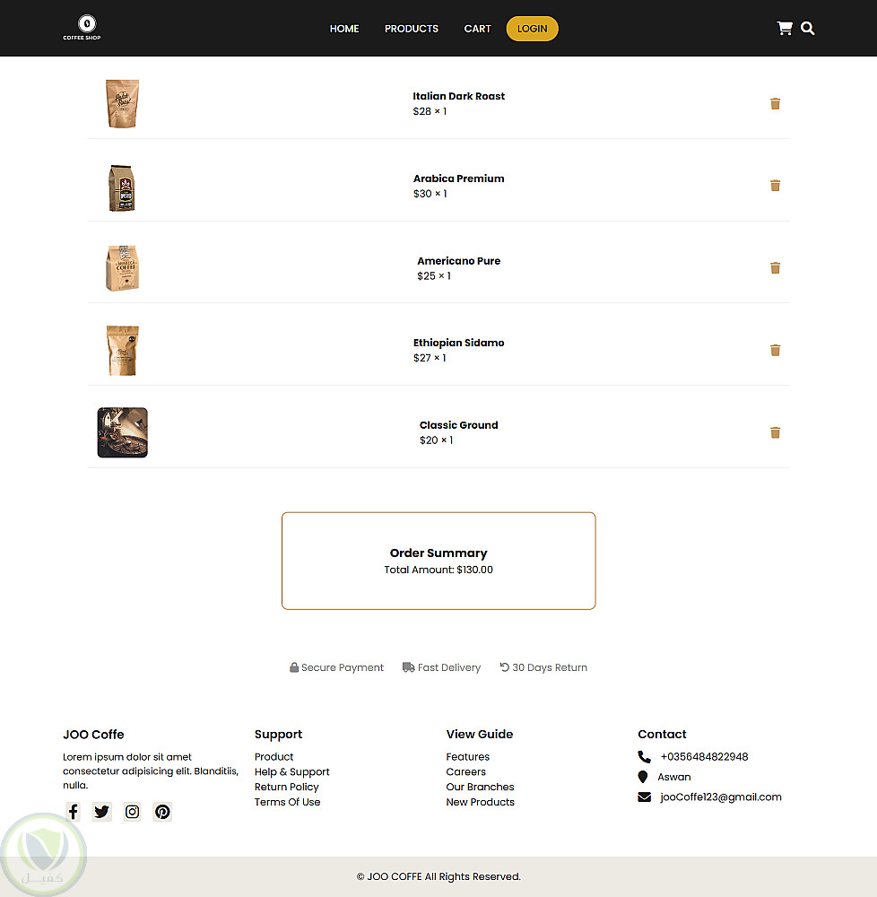 قمت بتطوير موقع ويب لبيع القهوة عبر الإنترنت يتيح للمستخدمين تصفح المنتجات وإدارة سلة المشتريات بسهولة.