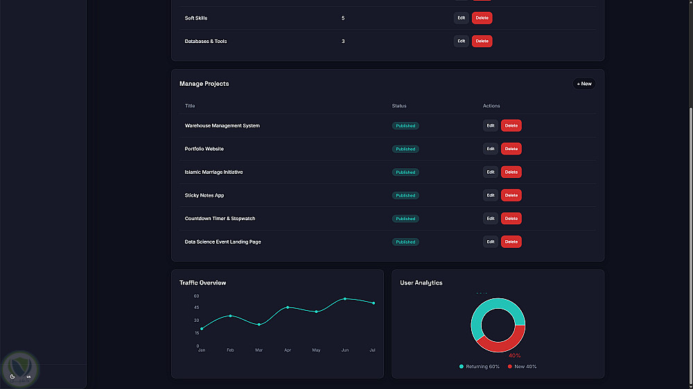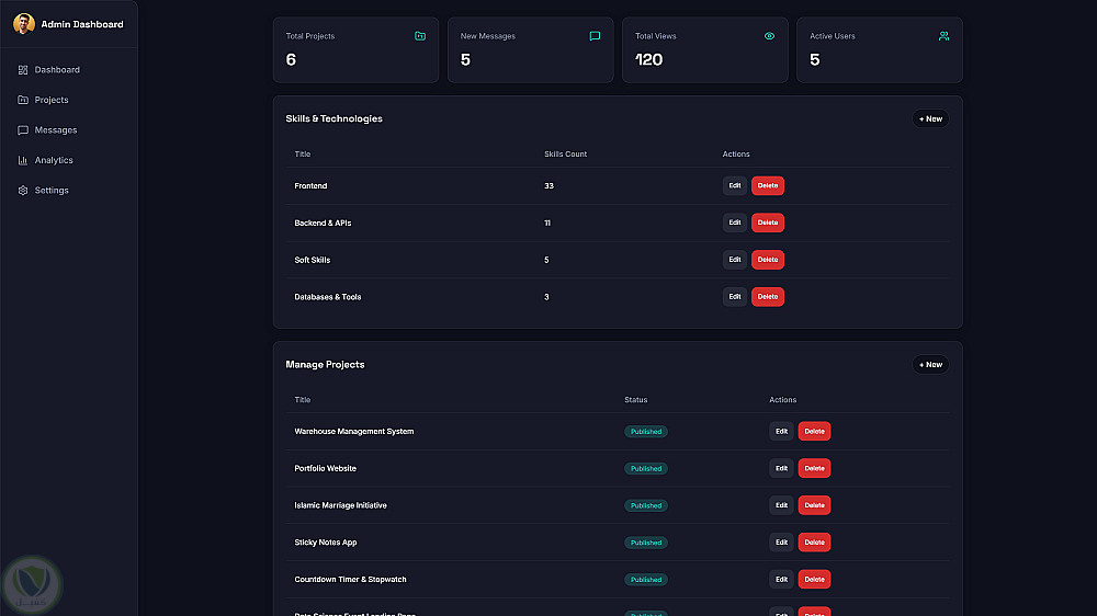 موقع سيرة ذاتية احترافي يتميز بتصميم حديث ومتجاوب مع دعم لغتين (الإنجليزية/العربية). يتكون المشروع من تطبيقين: موقع السيرة الذاتية الرئيسي لعرض الأعمال والمهارات، ولوحة تحكم إدارية منفصلة لإدارة المحتوى. تتضمن السيرة الذاتية قسم البطل مع صورة شخصية، وعرض المشاريع، وعرض المهارات منظمة حسب الفئات، ونموذج تواصل، وسيرة ذاتية قابلة للتنزيل. توفر لوحة التحكم الإدارية عمليات CRUD كاملة للمشاريع والمهارات مع إمكانيات إعادة الترتيب بالسحب والإفلات، ومصادقة Firebase، ومزامنة البيانات في الوقت الفعلي.