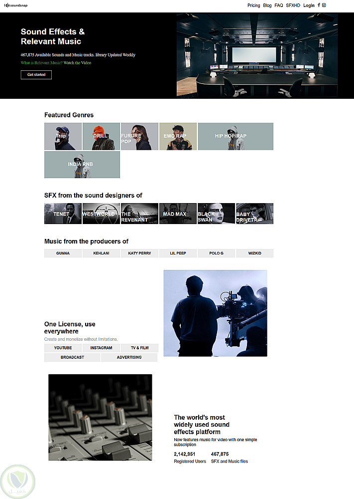 صفحة هبوط landing page لمنصة متخصصة في المؤثرات الصوتية soundsnap