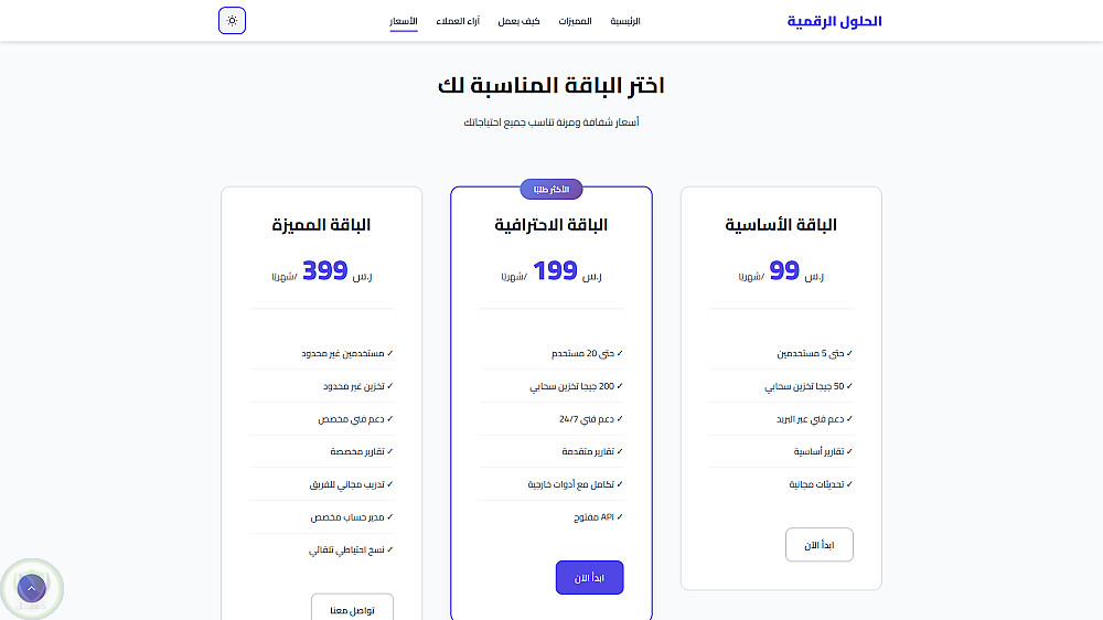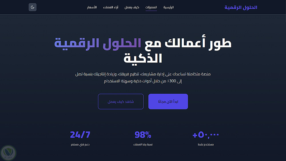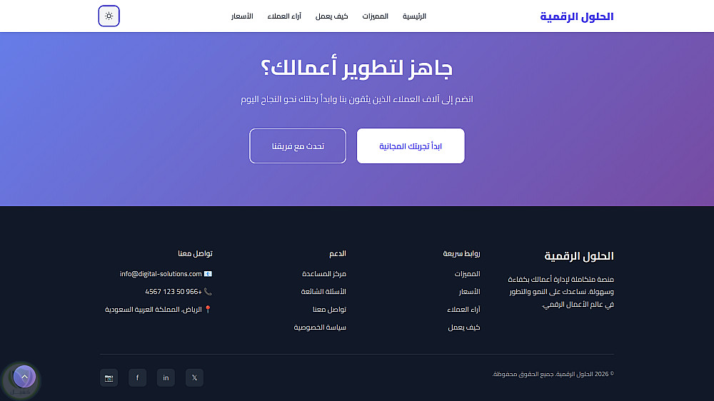 قمت بتصميم وتطوير صفحة هبوط احترافية باللغة العربية (RTL) مخصصة لمنصات الحلول الرقمية والشركات الناشئة، مع التركيز على تجربة مستخدم مميزة وتصميم عصري يساعد على زيادة التحويلات.