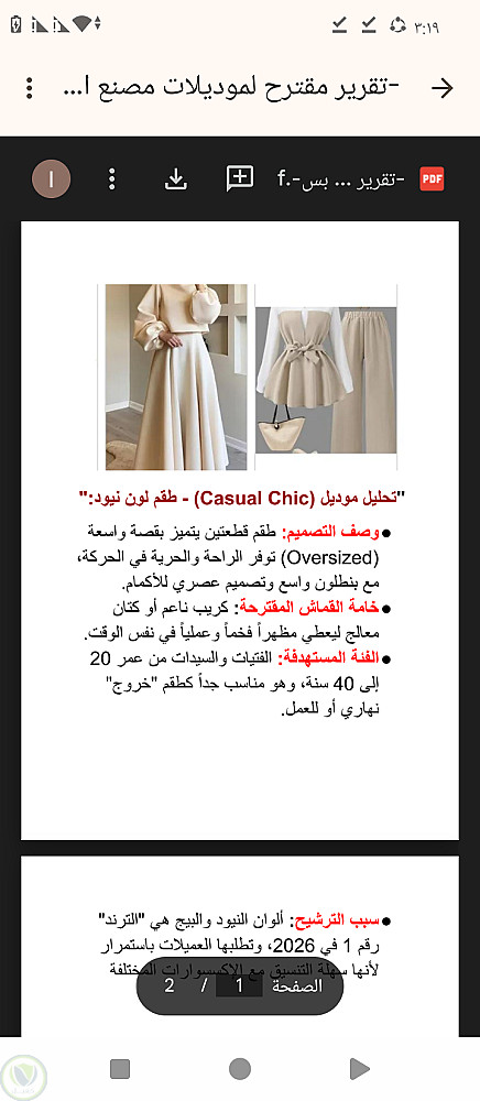 "نموذج احترافي قمت بإعداده باستخدام برامج الورد لتنسيق مجموعة ملابس نسائية، مع تقديم مقترحات للخامات (كريب، ساتان) وتحليل الفئات المستهدفة وأسباب اختيار الألوان الترند