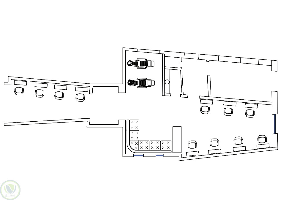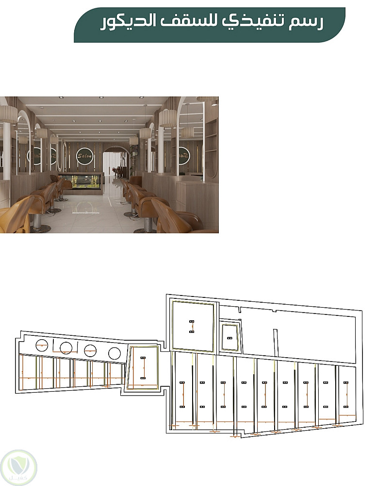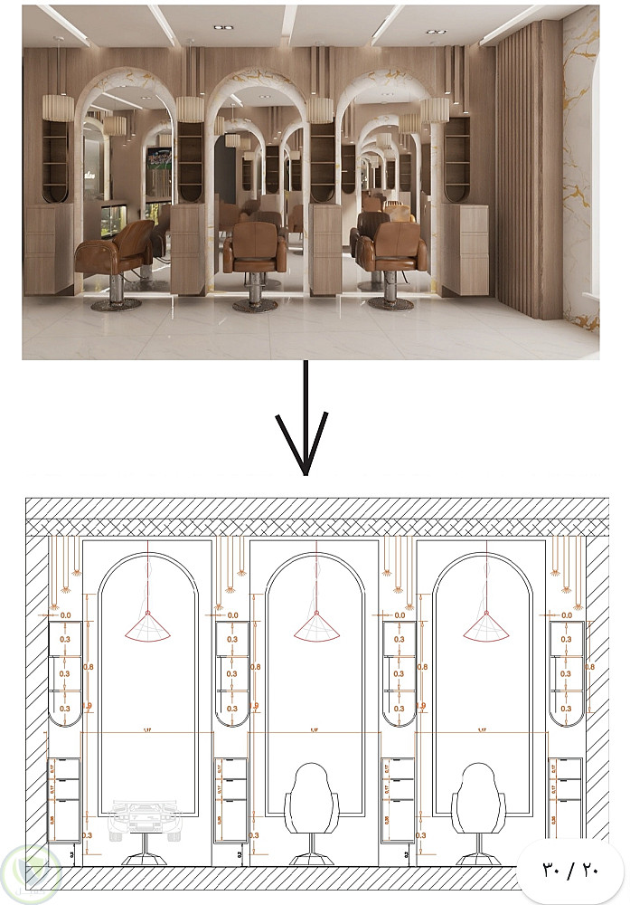 تخطيط وتوزيع وتصميم مدروس من كل النواحي الوضيفية والجمالية لصالون حلاقة مع مخططات تنفيذية للمقاسات لضمان نجاح المشروع