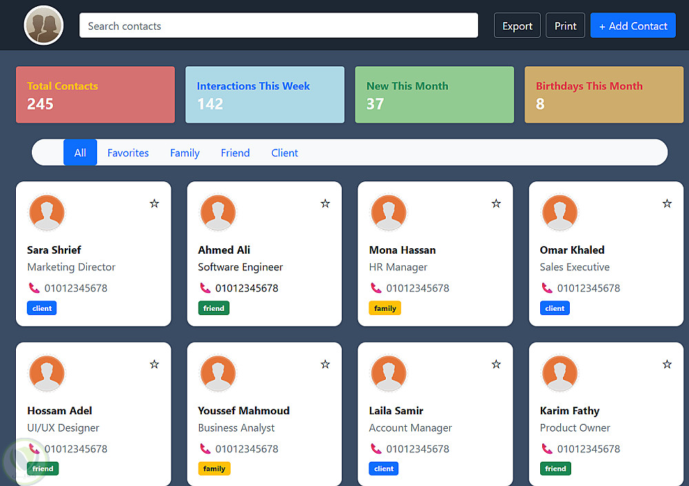 يوفّر النظام واجهة Cards منظمة لعرض بيانات كل جهة اتصال، مع إمكانية التمييز بالمفضلة، وإضافة جهات اتصال جديدة، بالإضافة إلى دعم الطباعة والتصدير.