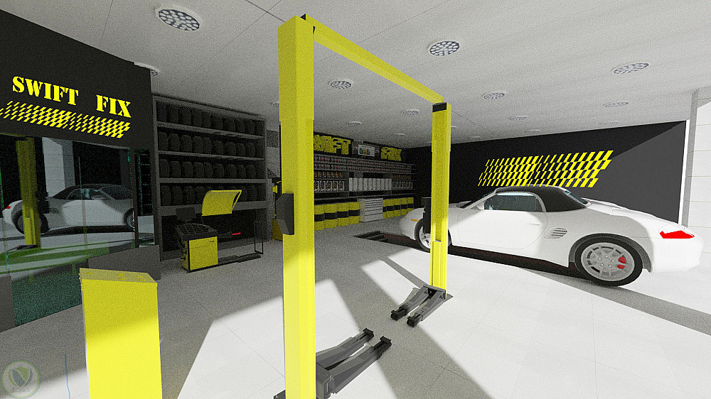 "تصميم داخلي مودرن لمركز صيانة سيارات (Swift Fix) بهوية بصرية مميزة"