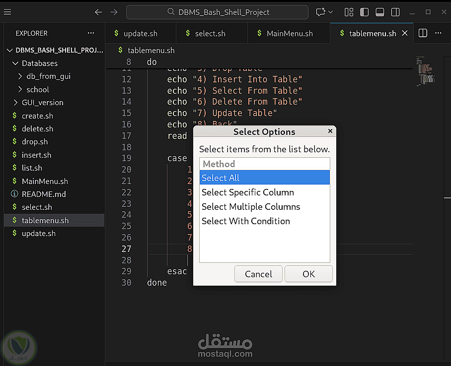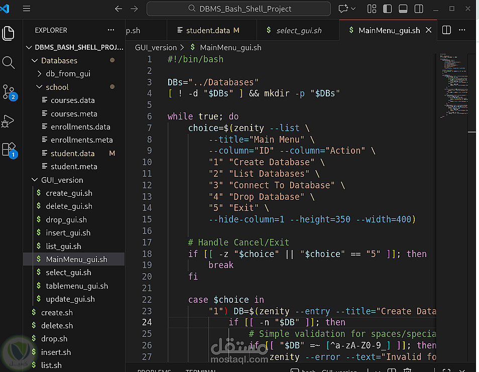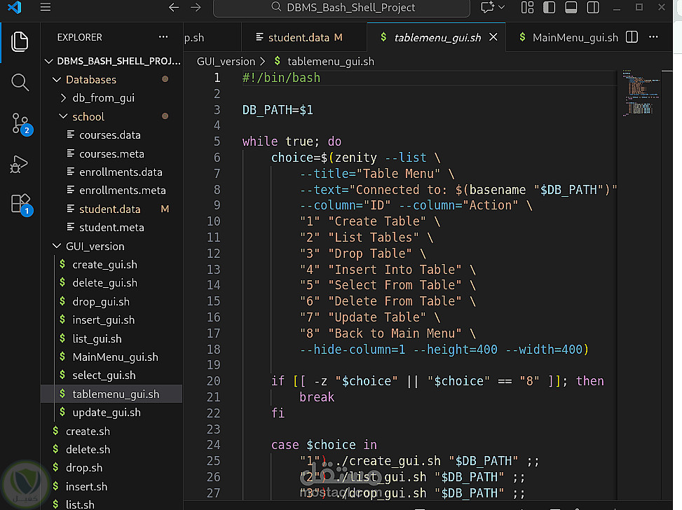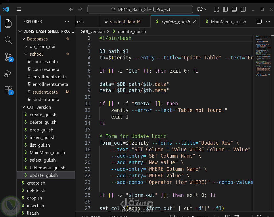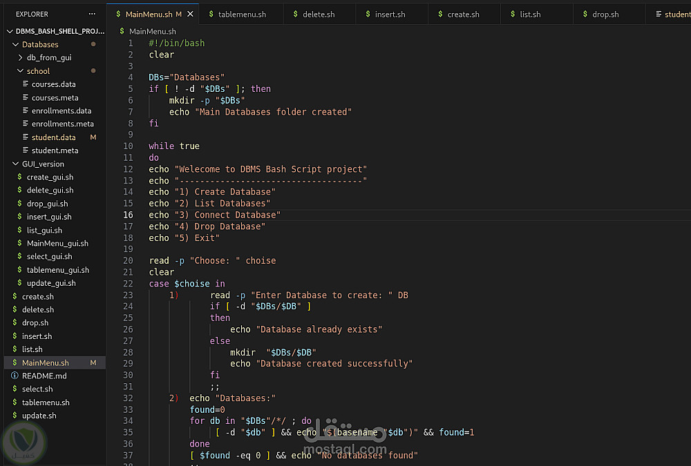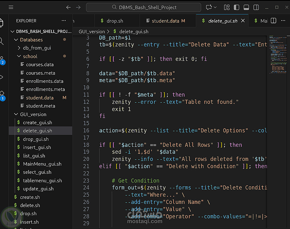مشروع DBMS Bash Script هو نظام مبسط لإدارة قواعد البيانات تم تطويره باستخدام Bash على Linux، ويهدف لإدارة البيانات الصغيرة بدون الحاجة لأي برامج خارجية. يوفر المشروع نسختين: CLI وGUI بسيطة داخل الـ Terminal، وكلتاهما تعتمد على قوائم تفاعلية لتنفيذ العمليات الأساسية مثل: إنشاء الجداول، عرضها، الحذف، الإدخال، التعديل، والاستعلام عن البيانات.