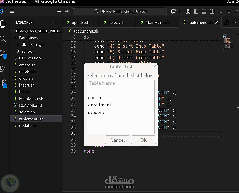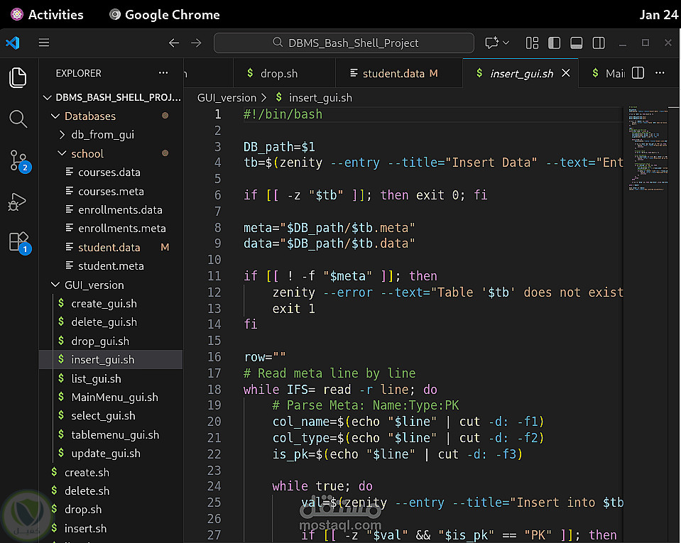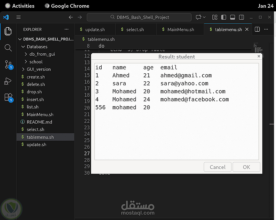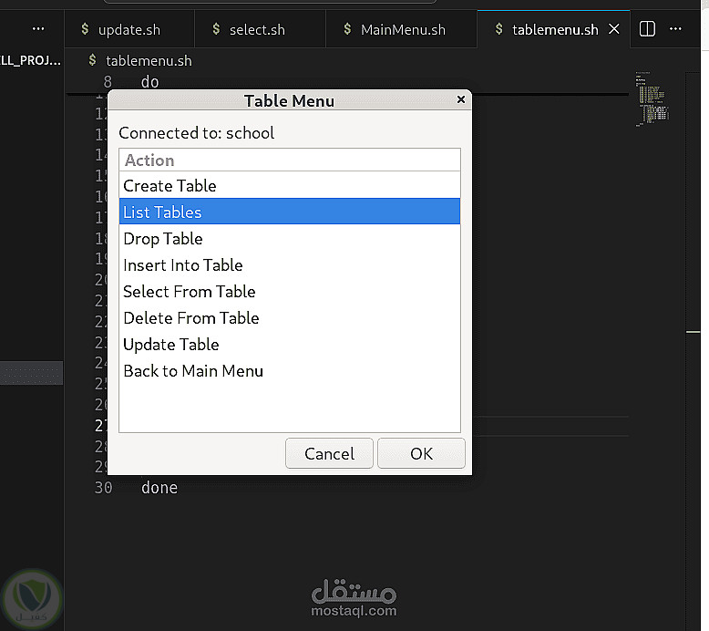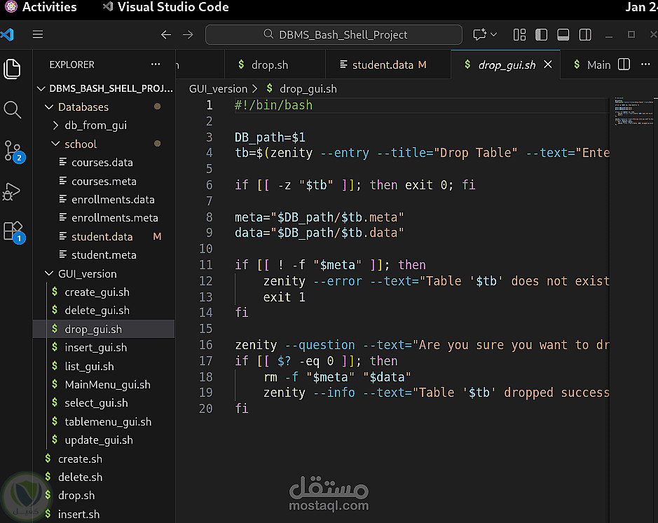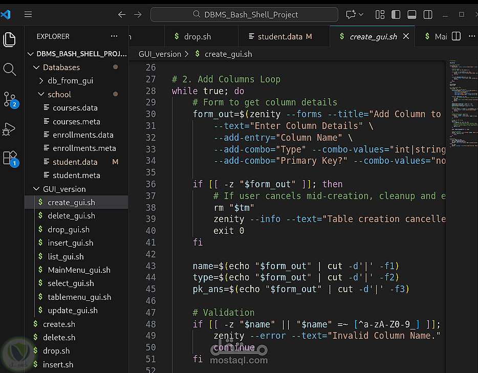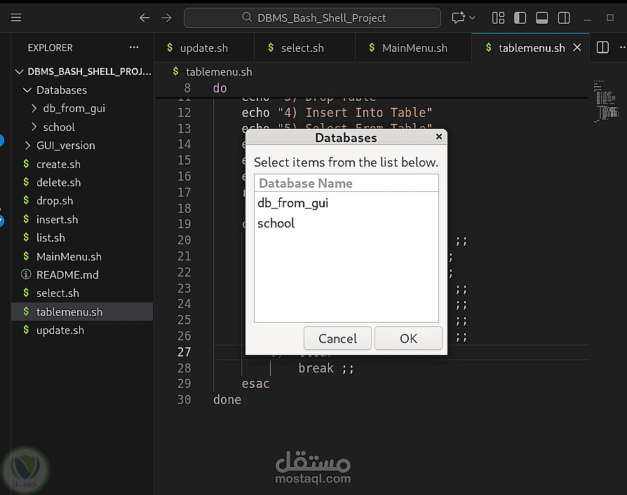 مشروع DBMS Bash Script هو نظام مبسط لإدارة قواعد البيانات تم تطويره باستخدام Bash على Linux، ويهدف لإدارة البيانات الصغيرة بدون الحاجة لأي برامج خارجية. يوفر المشروع نسختين: CLI وGUI بسيطة داخل الـ Terminal، وكلتاهما تعتمد على قوائم تفاعلية لتنفيذ العمليات الأساسية مثل: إنشاء الجداول، عرضها، الحذف، الإدخال، التعديل، والاستعلام عن البيانات.