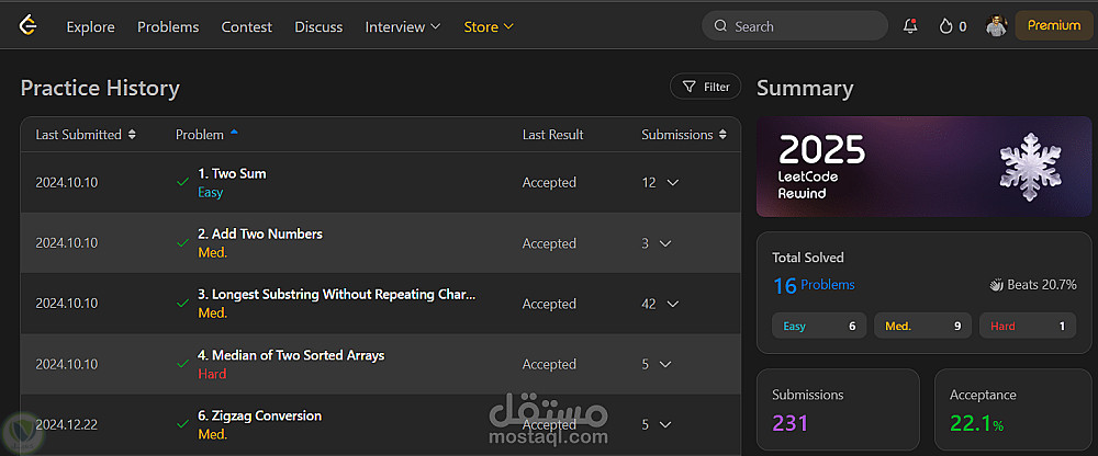 مما يعكس خبرة قوية في Problem Solving و Data Structures & Algorithms، وقدرة على التعامل مع مسائل متنوعة بمستويات صعوبة مختلفة.