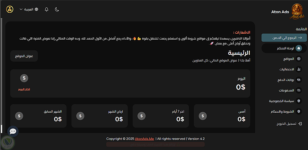 لوحة التحكم Aton Ads هي القلب النابض لإدارة الإعلانات، تُمكّن المعلنين والناشرين من التحكم الكامل في الحملات والأرباح من خلال واجهة حديثة وسريعة مبنية بـ React.js وTailwind CSS، مع دعم كامل للغتين العربية والإنجليزية، ومصممة خصيصًا للسوق العربي والدولي.
