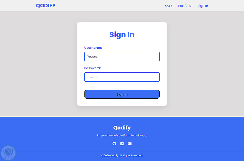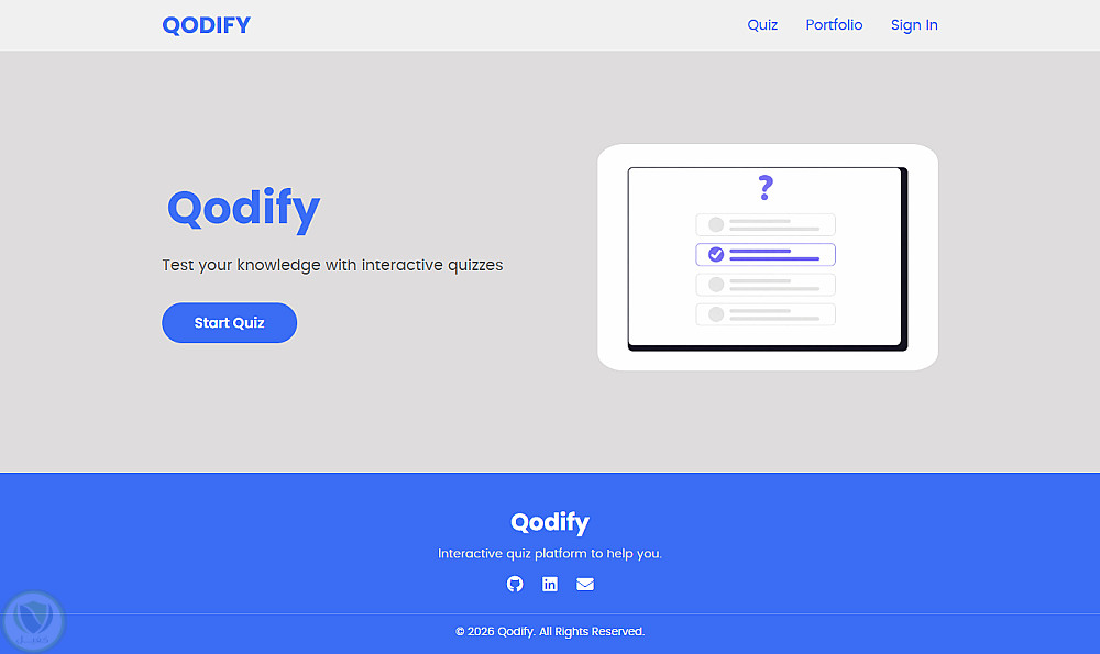 Qodify هو موقع ويب تفاعلي لعمل الاختبارات (Quizzes) أونلاين، مصمم بواجهة حديثة وبسيطة تركز على تجربة المستخدم وسهولة الاستخدام.