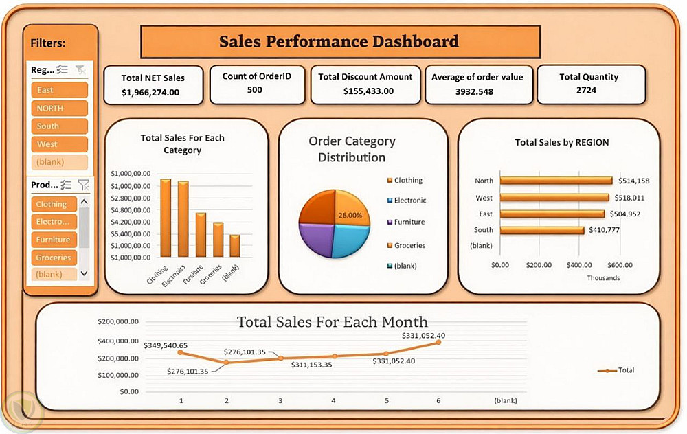 لوحة تحكم لعرض وتحليل أداء المبيعات حسب المناطق والفئات المختلفة، مع تتبع صافي المبيعات، الخصومات، ومتوسط قيمة الطلب. تم تصميم Dashboard لدعم الإدارة في متابعة الأداء وتحديد نقاط القوة والضعف.