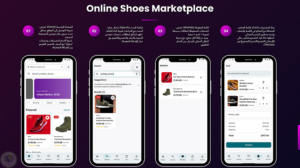 تطبيق متجر أحذية إلكتروني مبني بـ Flutter (واجهة أمامية فقط) يحاكي تجربة تسوّق كاملة بتصميم بوتيكي فاخر وفق Material 3. يشمل تدفّقًا متكاملًا من Splash/Onboarding إلى الاستكشاف والكتالوج والبحث ثم تفاصيل المنتج، المفضلة، السلة، والدفع بثلاث خطوات مع شاشة نجاح، إضافة إلى تتبّع الطلبات بحالات وتايملاين. يعتمد على go_router للتنقّل السلس وحفظ حالة التبويبات، وflutter_bloc (Cubit) لإدارة الحالة بشكل منظم، مع دعم تعدد اللغات EN/AR وواجهة RTL ووضع فاتح/داكن. البيانات تُدار عبر Mock Repositories مع تأخير وهمي لمحاكاة الشبكة، مع تغطية واضحة لحالات التحميل/الفراغ/الخطأ وبنية Feature-first قابلة للتوسّع والربط لاحقًا بباك-إند حقيقي.