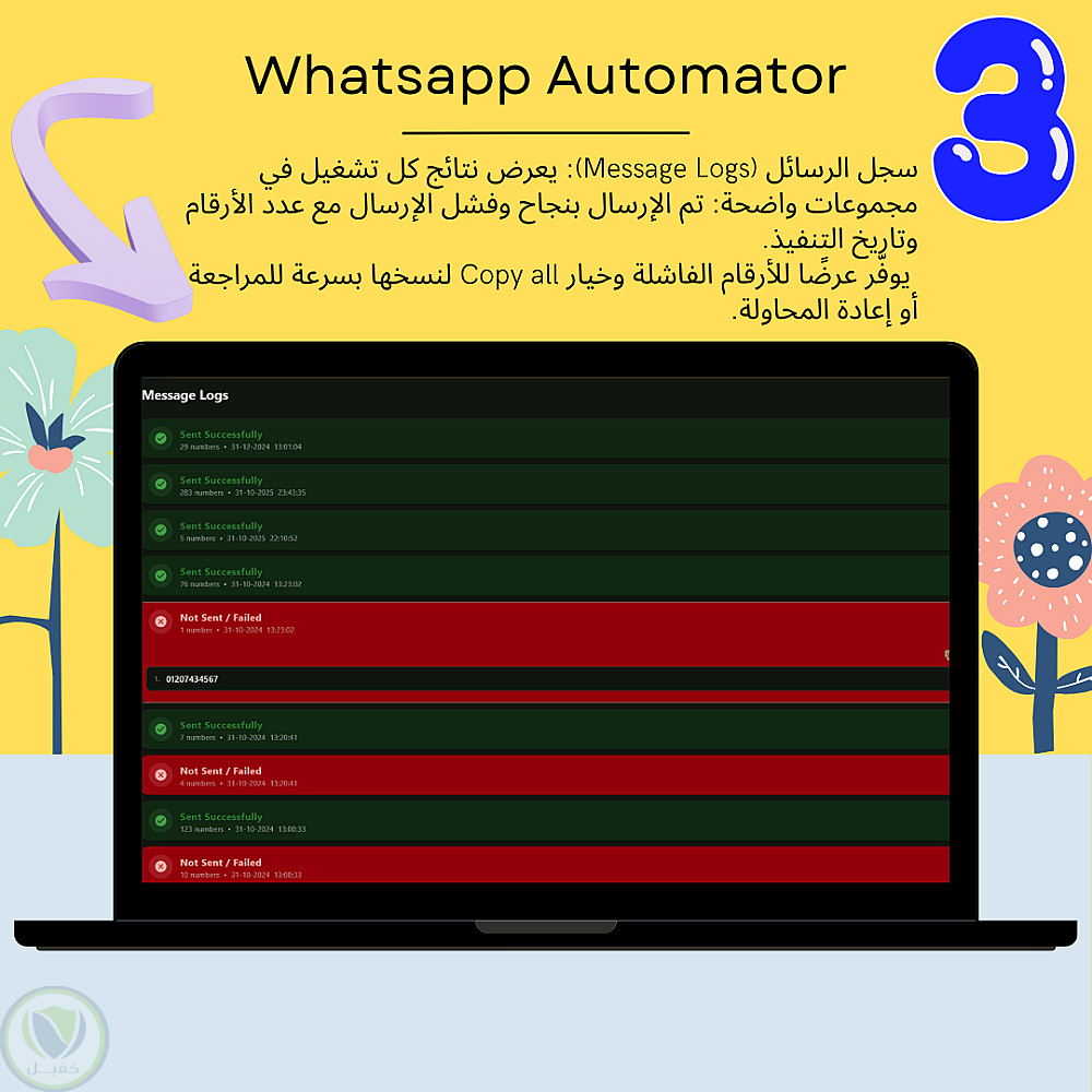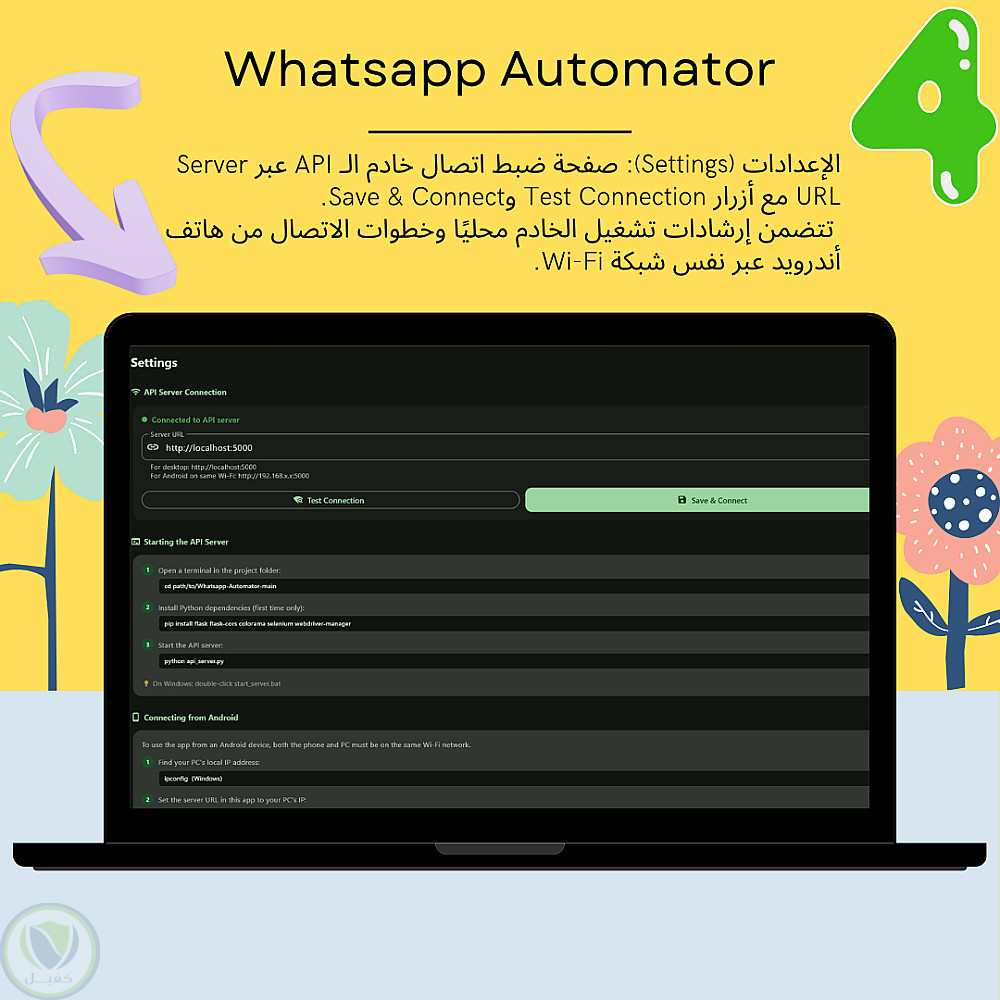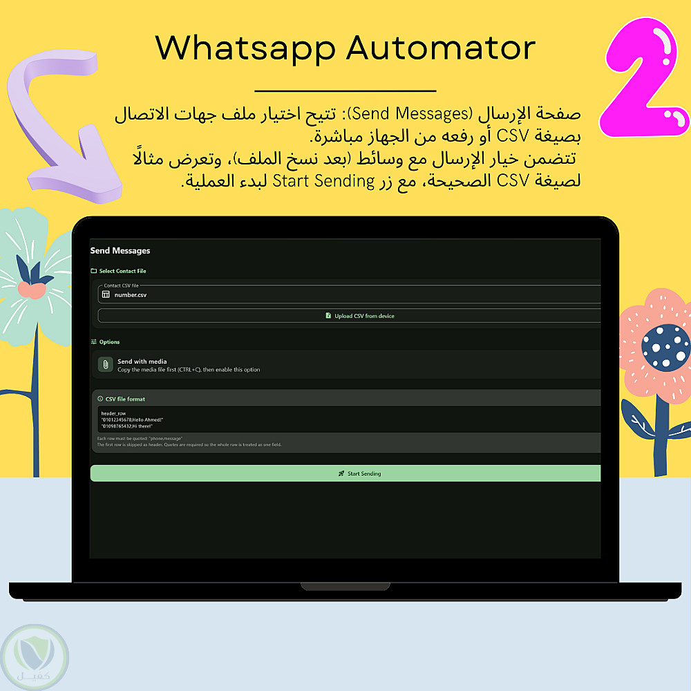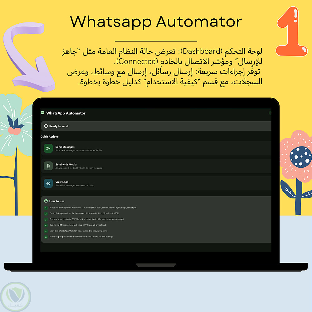 هو نظام متكامل لإرسال رسائل واتساب بالجملة بشكل آلي عبر **WhatsApp Web** باستخدام **Selenium**، مع واجهة سطح مكتب حديثة على **Flutter (Windows)**. يعمل عبر معمارية واضحة: تطبيق Flutter يرسل أوامر عبر REST إلى **خادم Python Flask**، والخادم بدوره يشغّل بوت Selenium الذي يفتح Chrome ويحافظ على جلسة تسجيل الدخول (QR مرة واحدة) ثم يرسل رسائل **مُخصّصة** لكل رقم من ملف **CSV**. يوفّر لوحة متابعة مباشرة للحالة والتقدّم (تم/متبقّي/نسبة)، شاشة إرسال مع رفع ملفات CSV ودعم إرسال وسائط، وسجلّات للأرقام الناجحة والفاشلة مع نسخ سريع، بالإضافة إلى إعدادات لاختبار الاتصال وتغيير عنوان الخادم، مع زر إيقاف فوري يُنهي الجلسة ويعيد النظام للوضع الخامل.