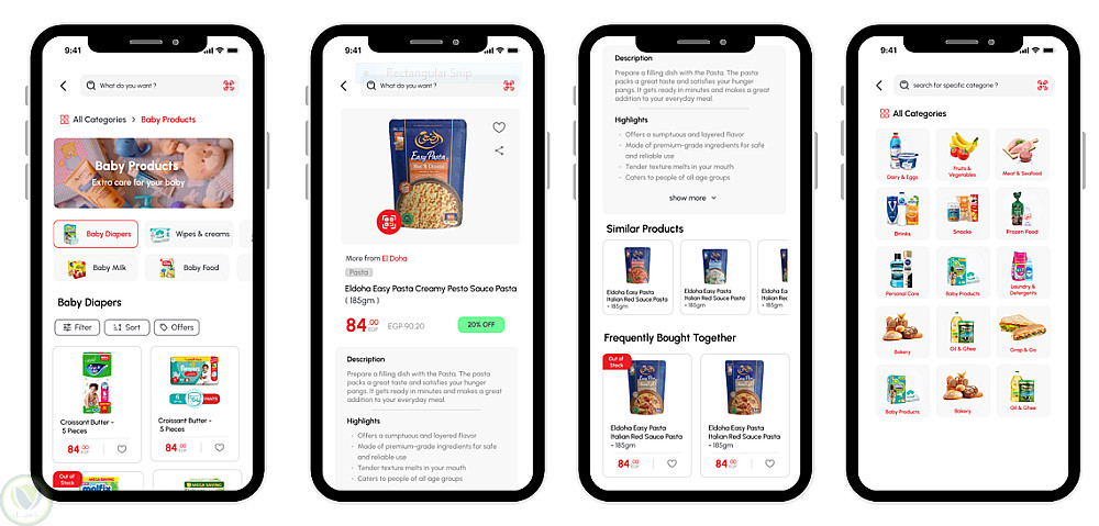 يتضمن التطبيق مجموعة من المزايا، من بينها إدارة قائمة المفضلة، وتوصيات المنتجات، وإمكانية البحث عن المنتجات بالاسم أو من خلال الباركود. كما تم تنفيذ نظام مصادقة آمن يشمل تسجيل الدخول، وإنشاء حساب جديد، والتحقق عبر رمز التحقق (OTP)، بالإضافة إلى خاصية إعادة تعيين كلمة المرور.
