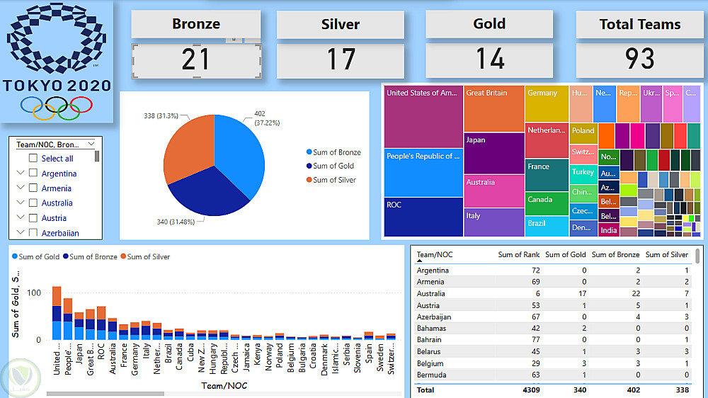 لوحة معلومات (Dashboard) لتحليل توزيع الميداليات في أولمبياد طوكيو 2020، قمت بإنشاؤها باستخدام Power BI