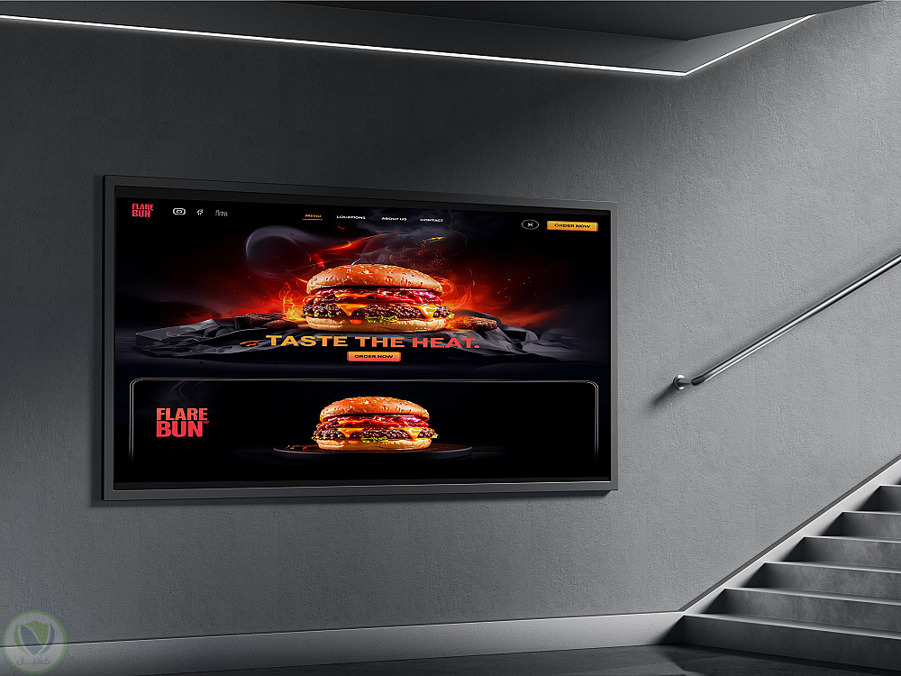 تصميم واجهة موقع عصري لمطعم "Flare Bun" يعكس طابع البراند الناري والحيوي.