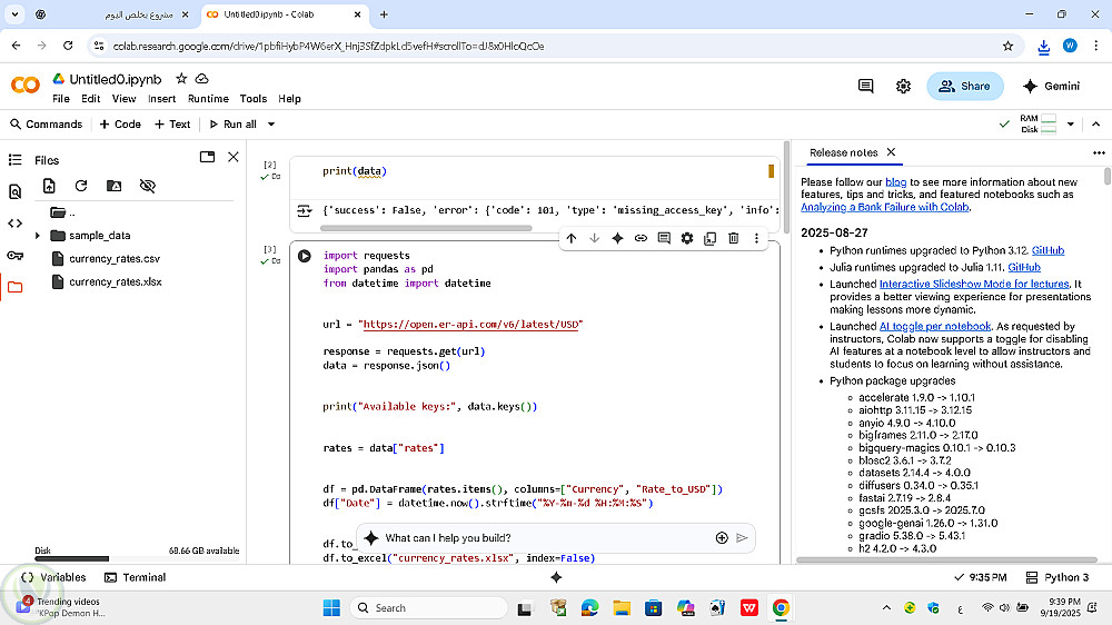 مشروع عملي باستخدام Python قمت فيه ببناء Data Pipeline يسحب بيانات من API مفتوح (مثال: أسعار العملات)، وينظمها في جدول ثم يحفظها تلقائيًا في ملفات CSV وExcel مع تسجيل وقت وتاريخ السحب.
