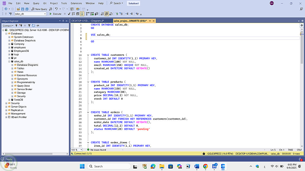 نفذت مشروع إدارة المبيعات (Sales Management System) باستخدام SQL، ويتضمن: