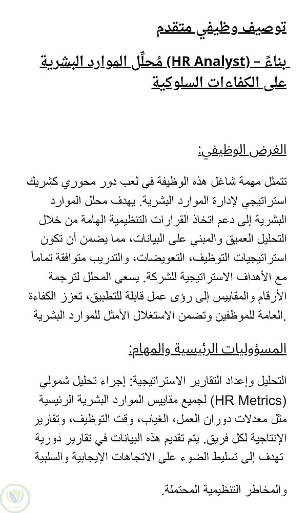 توصيف وظيفي احترافي (Job Description) لمُحلِّل موارد بشرية – نموذج يعتمد على الكفاءات السلوكية.