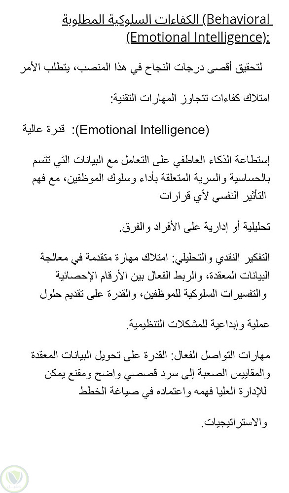 لقد تم إعداد هذا التوصيف لوظيفة محلل الموارد البشرية (HR Analyst)، ولم يقتصر على سرد المهام التقليدية. بل كان الهدف الأساسي هو ضمان جذب الكفاءات التي تمتلك المهارات السلوكية اللازمة فعلاً للنجاح.