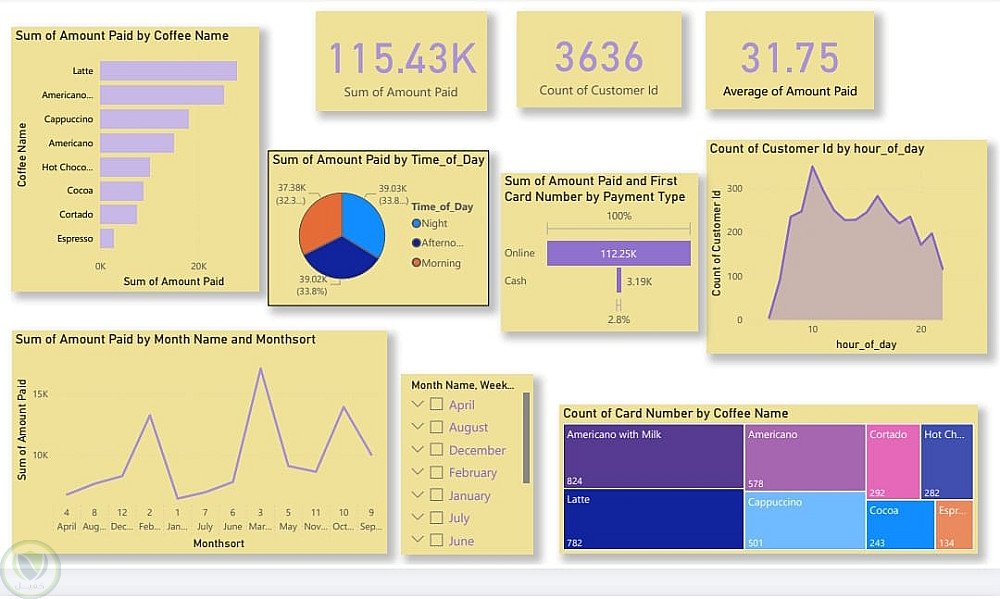 هذا التقرير يعرض تحليل تفصيلي لمبيعات القهوه خلال لوحات إلى power bi حيث يوضح إجمالي المبالغ المدفوعه و عدد العملاء و متوسط الانفاق كما يتضمن تحليلا حسب انواع القهوه و اوقات اليوم و طرق الدفع و الاشهر المختلفه مما يساعد علي فهم اتجاهات الشراء و سلوك العملاء لتحديد افضل الأوقات و المنتجات تحقيقا الإيرادات