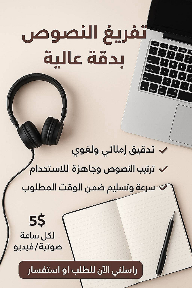 أقدم خدمة تفريغ صوت وفيديو إلى نصوص مكتوبة بدقة عالية 100٪، مع تنسيق كامل للنص باستخدام علامات الترقيم الصحيحة وتصحيح الأخطاء الإملائية والنحوية.