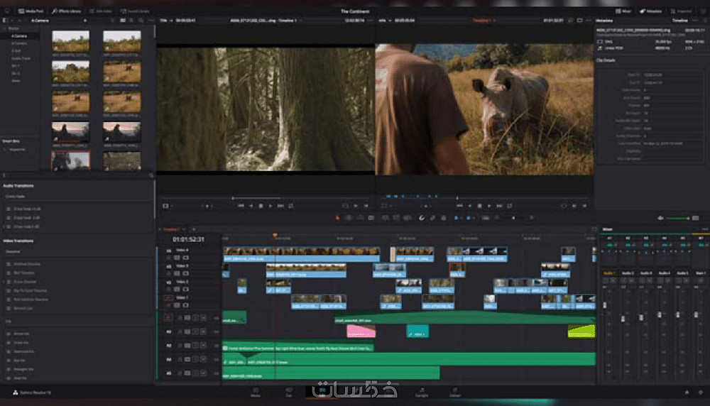 تقنيات مونتاج متقدمة تشمل تأثيرات، انتقالات، موسيقى، وتصحيح الألوان.