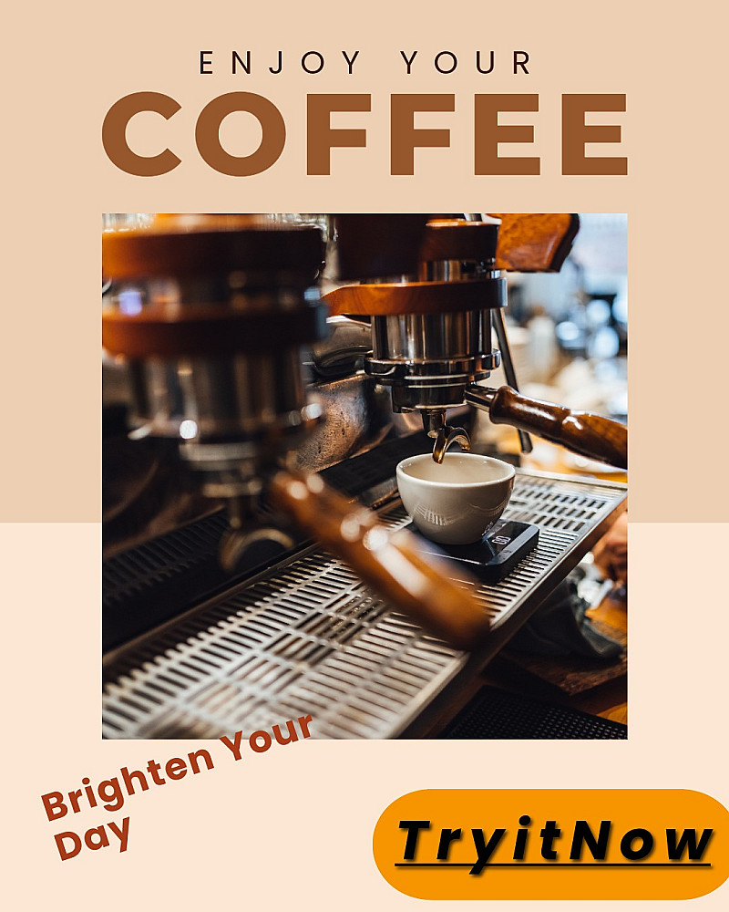 التصميم يحتوي على عناصر بصرية قوية مثل عبارة "استمتع بقهوتك" ونداء واضح للتجربة "جرّبها الآن"، ويمكن تعديل النصوص والألوان لتناسب هوية علامتك التجارية.