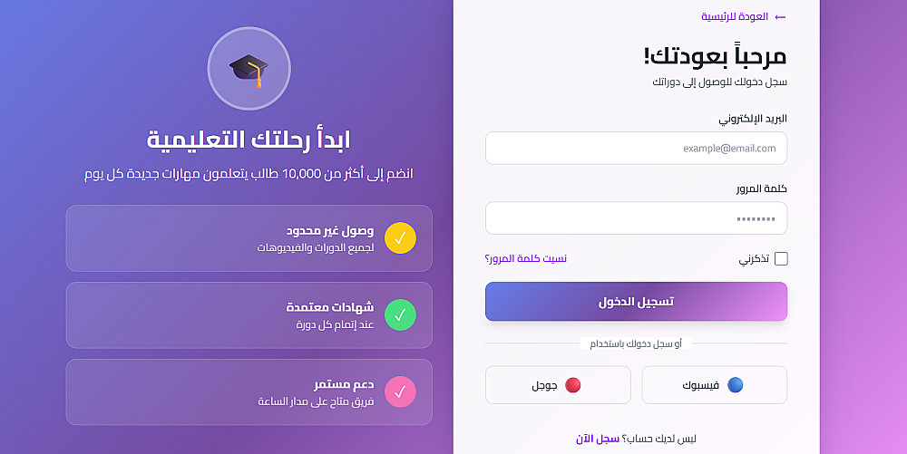 صفحتين هبوط لعرض المنصة والكورسات، صفحة تسجيل دخول بتصميم احترافي، تصميم عصري مناسب للمنصات التعليمية، وكود منظم قابل للتطوير لاحقًا.