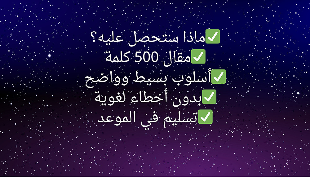 أقدّم خدمة كتابة مقالات ومحتوى عربي بأسلوب سهل وواضح يناسب مختلف الفئات، مع الاهتمام بتنظيم الأفكار وسلامة اللغة والالتزام بموعد التسليم.