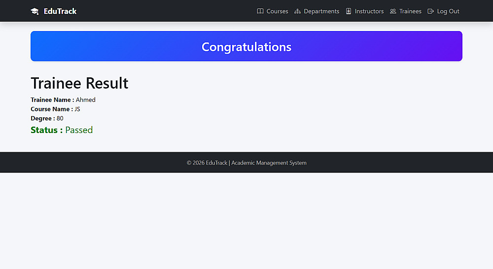 النظام يتيح إنشاء حسابات المستخدمين وتسجيل الدخول، وإدارة الكورسات والأقسام والمدربين والمتدربين، مع عرض النتائج وتحليل حالة النجاح أو الرسوب بطريقة منظمة وسهلة الاستخدام.