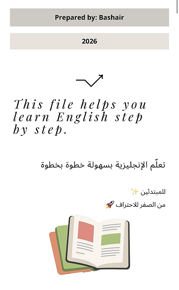 أقدّم ملف PDF لتعليم اللغة الإنجليزية للمبتدئين بطريقة سهلة ومنظمة خطوة بخطوة.