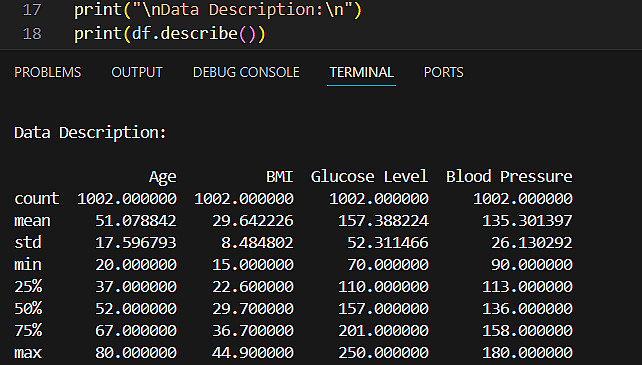 تحليل إحصائي شامل لاستخراج الأنماط والعلاقات المهمة بين العوامل الصحية مثل العمر، مؤشر كتلة الجسم، ضغط الدم، مستوى السكر، والتاريخ العائلي.