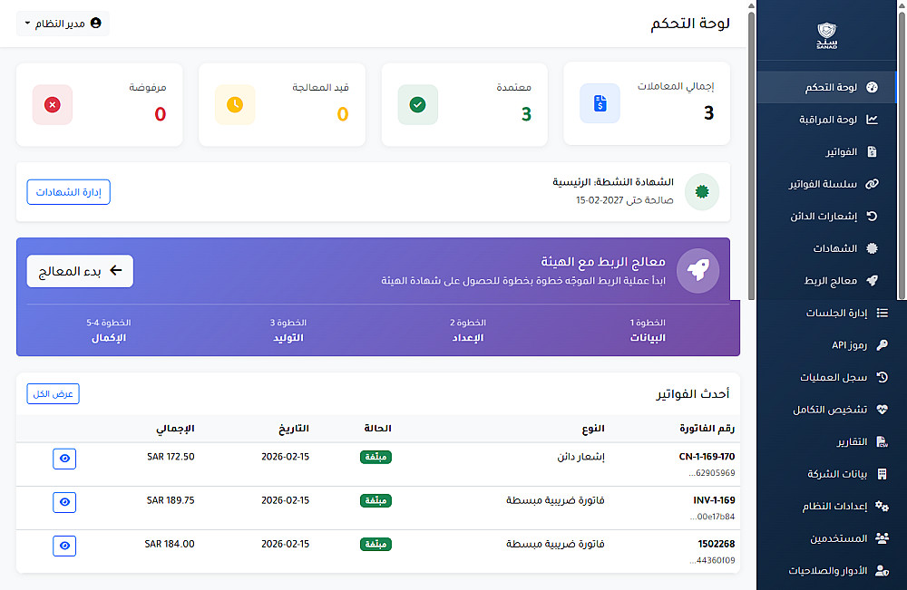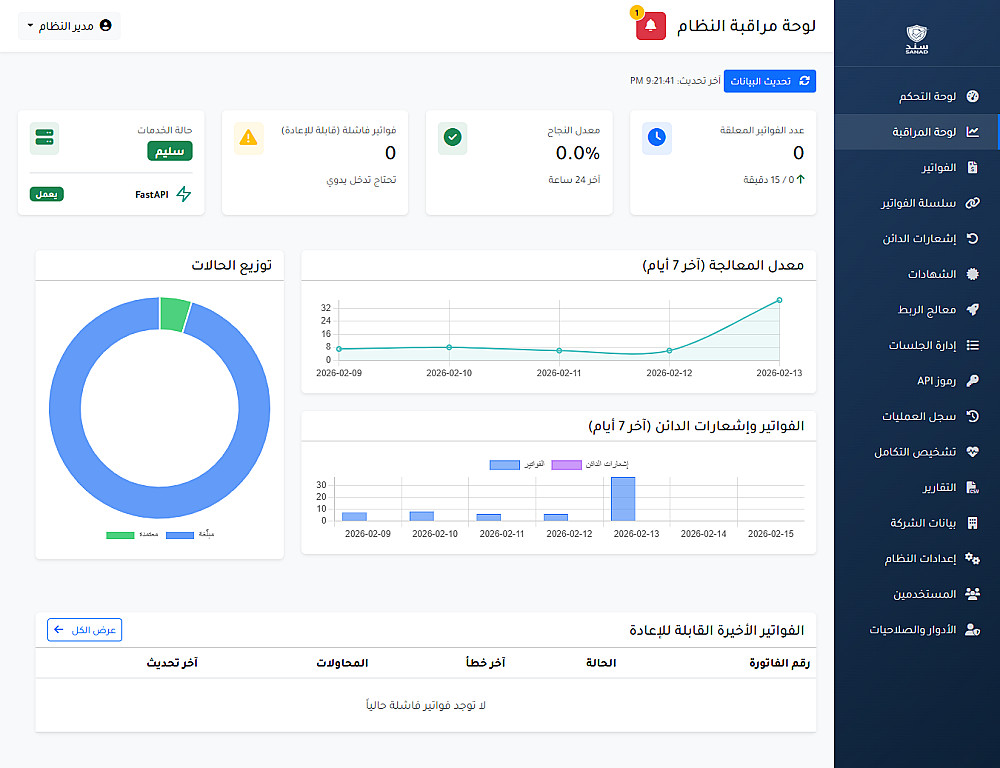 شاشة مركزية تعرض إحصائيات فورية: عدد الفواتير (المقبولة/المرفوضة)، حالة الاتصال مع ZATCA، ومؤشرات الأداء.