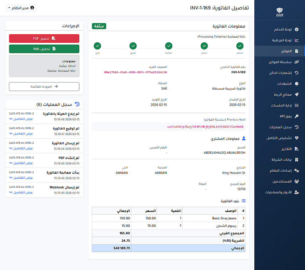 سلامة البيانات :نظام Hash Chaining يضمن تتابع الفواتير ومنع التلاعب بالسجلات التاريخية.