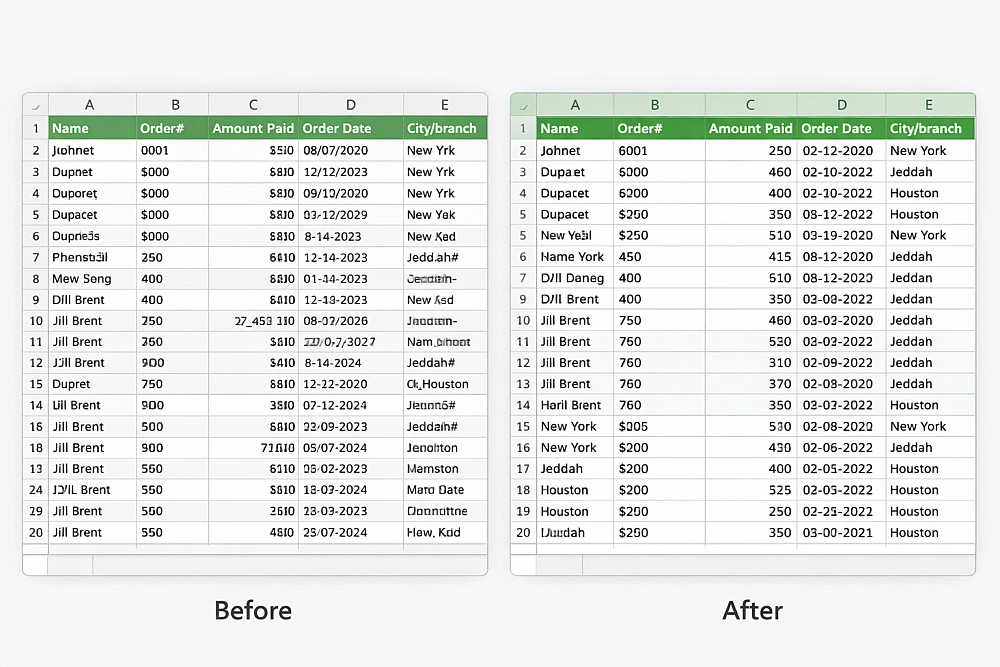 إذا كنت تواجه مشاكل مثل التكرار، أخطاء الإدخال، تنسيقات غير موحدة، أو أعمدة غير منظمة، يمكنني مساعدتك في ترتيب بياناتك بشكل احترافي.