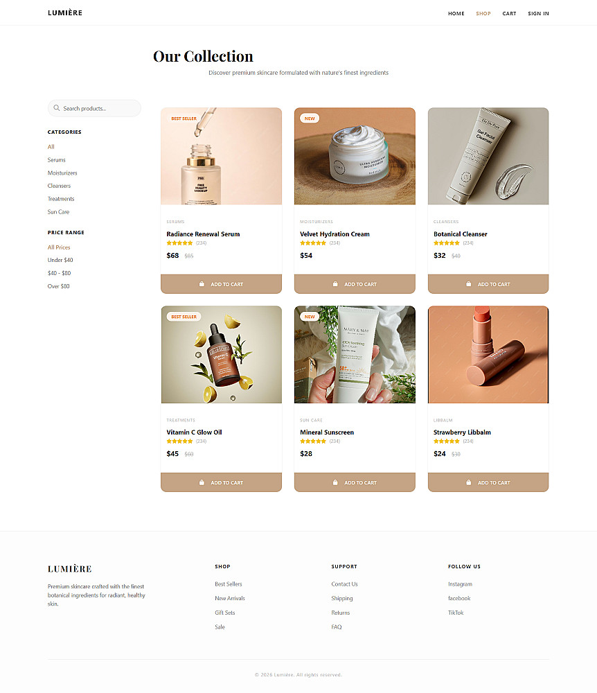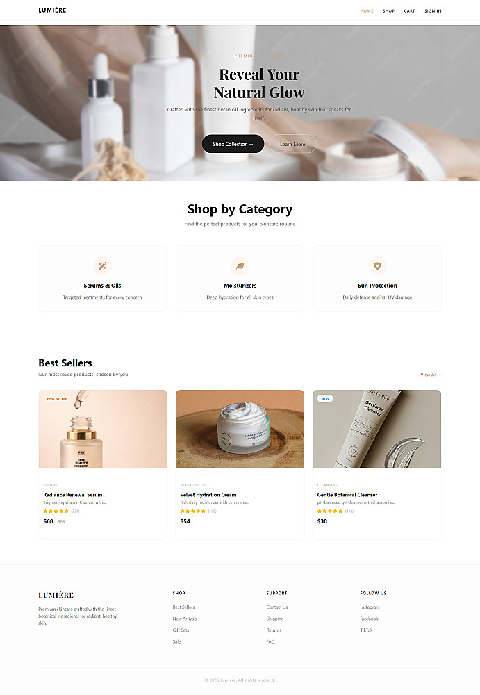 أقدّم لك تصميم ويب سايت عصري بتجربة مستخدم سلسة ومظهر High-End مناسب لعلامات التجميل الحديثة.