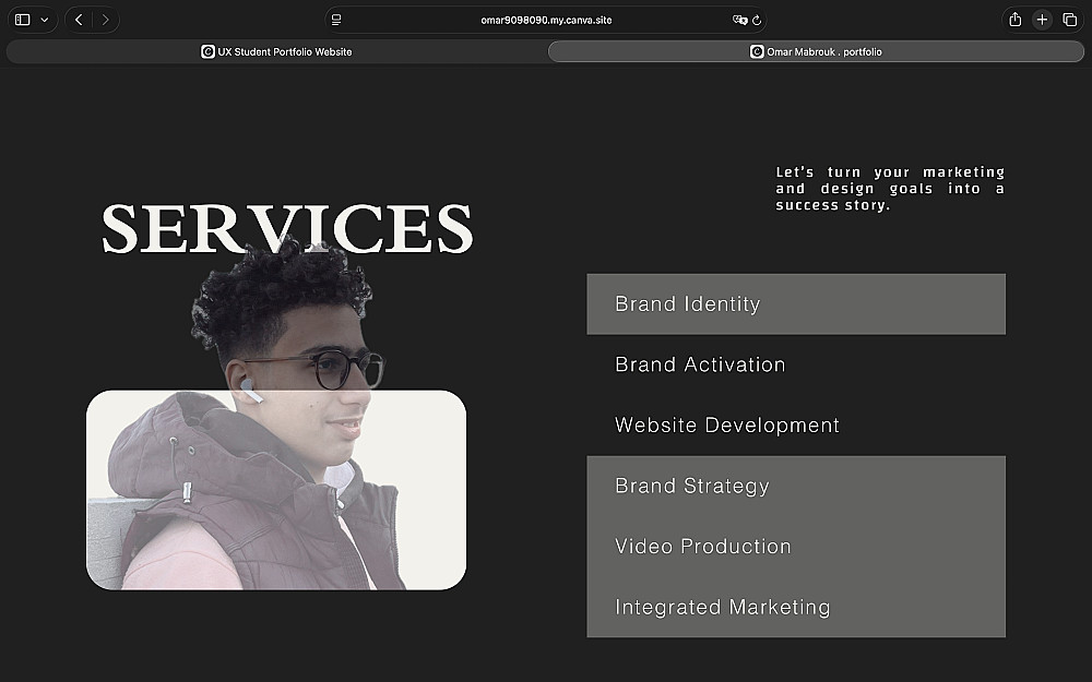 أقسام متكاملة: (عني، معرض أعمالي، مهاراتي، تواصل معي).