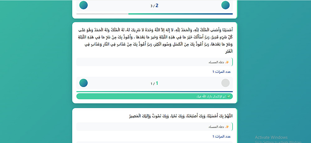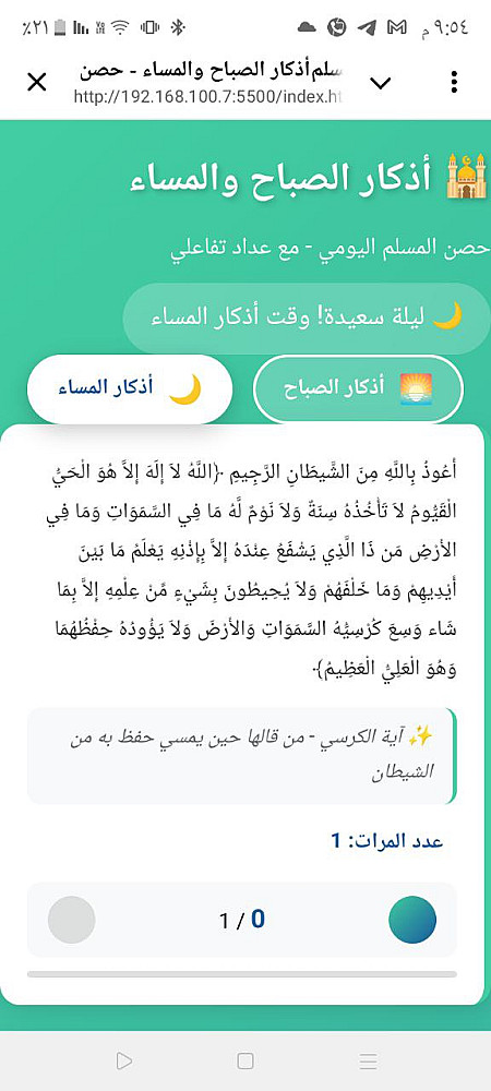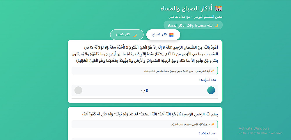 تطوير تطبيق ويب لأذكار الصباح والمساء مع عداد تفاعلي