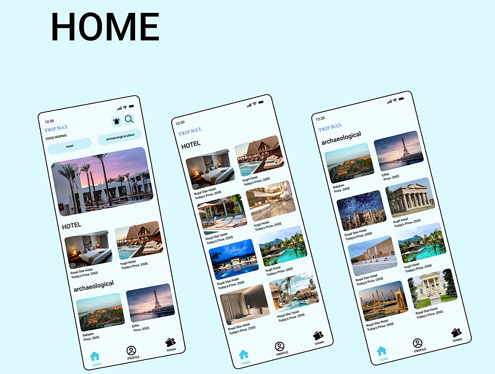 TRIP MAX is a hotel booking mobile app concept focused on delivering a smooth and intuitive booking experience. The design helps users easily explore hotels, compare options, and complete reservations with minimal friction. The interface emphasizes clarity, comfort, and usability through a clean layout, clear visual hierarchy, and thoughtful spacing. Each screen is designed to guide users naturally through the booking flow-from browsing and filtering to viewing details and confirming stays.