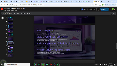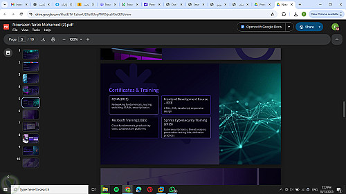 أنا نورسين طارق، طالبة في كلية الحاسبات والذكاء الاصطناعي، تخصص Cyber Security. أتمتع بالانضباط والتنظيم وأؤمن بأهمية الالتزام والتعلم المستمر في مجالي. ....